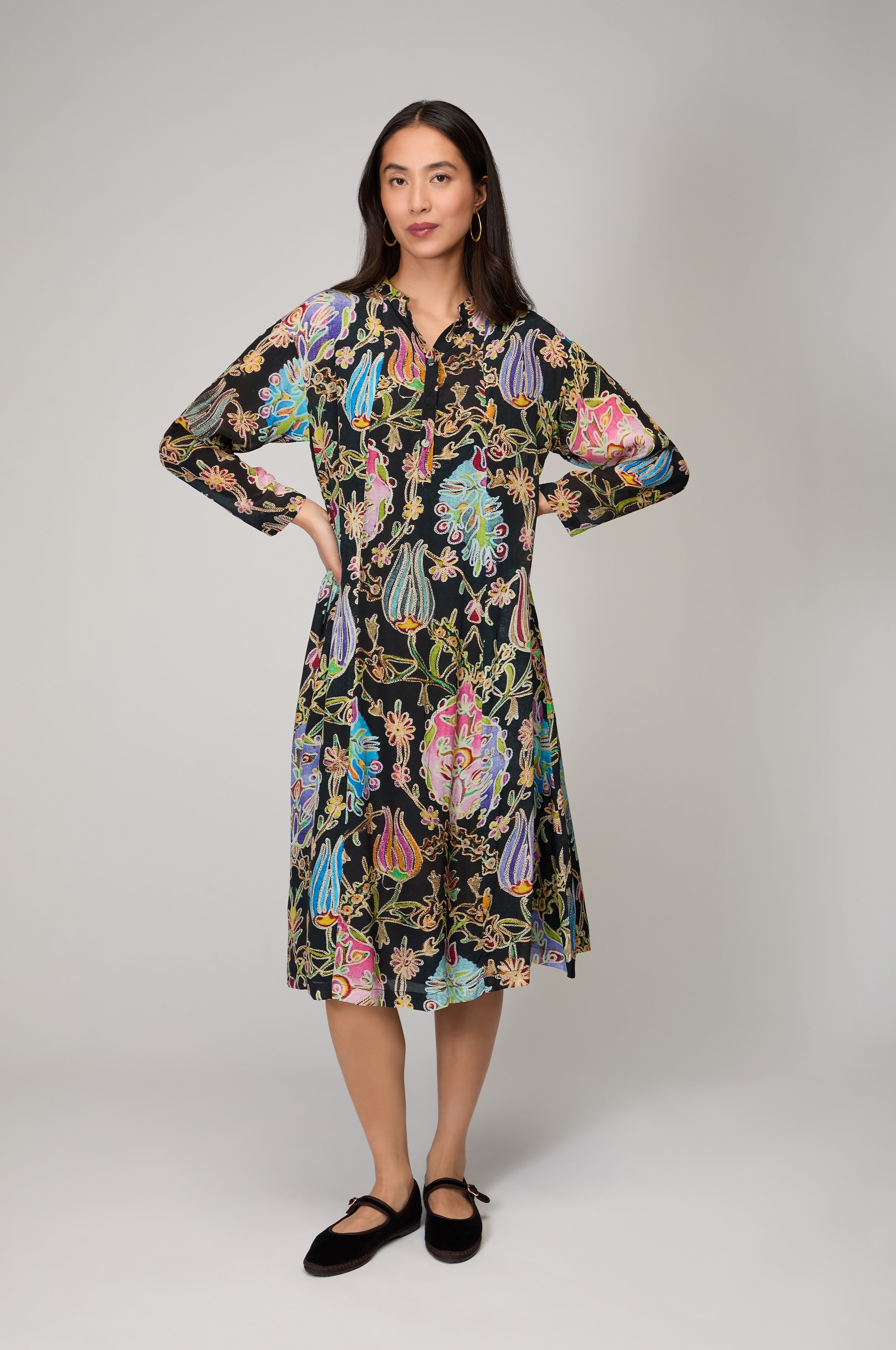The Yavi Protea Flower Dress is a painterly interpretation of natural beauty. Its fabric becomes a canvas for expressive protea blooms, rendered in a palette that feels both vibrant and organic. Cut to a flattering shape with ease of movement, the dress has a flowing silhouette that drapes gracefully.