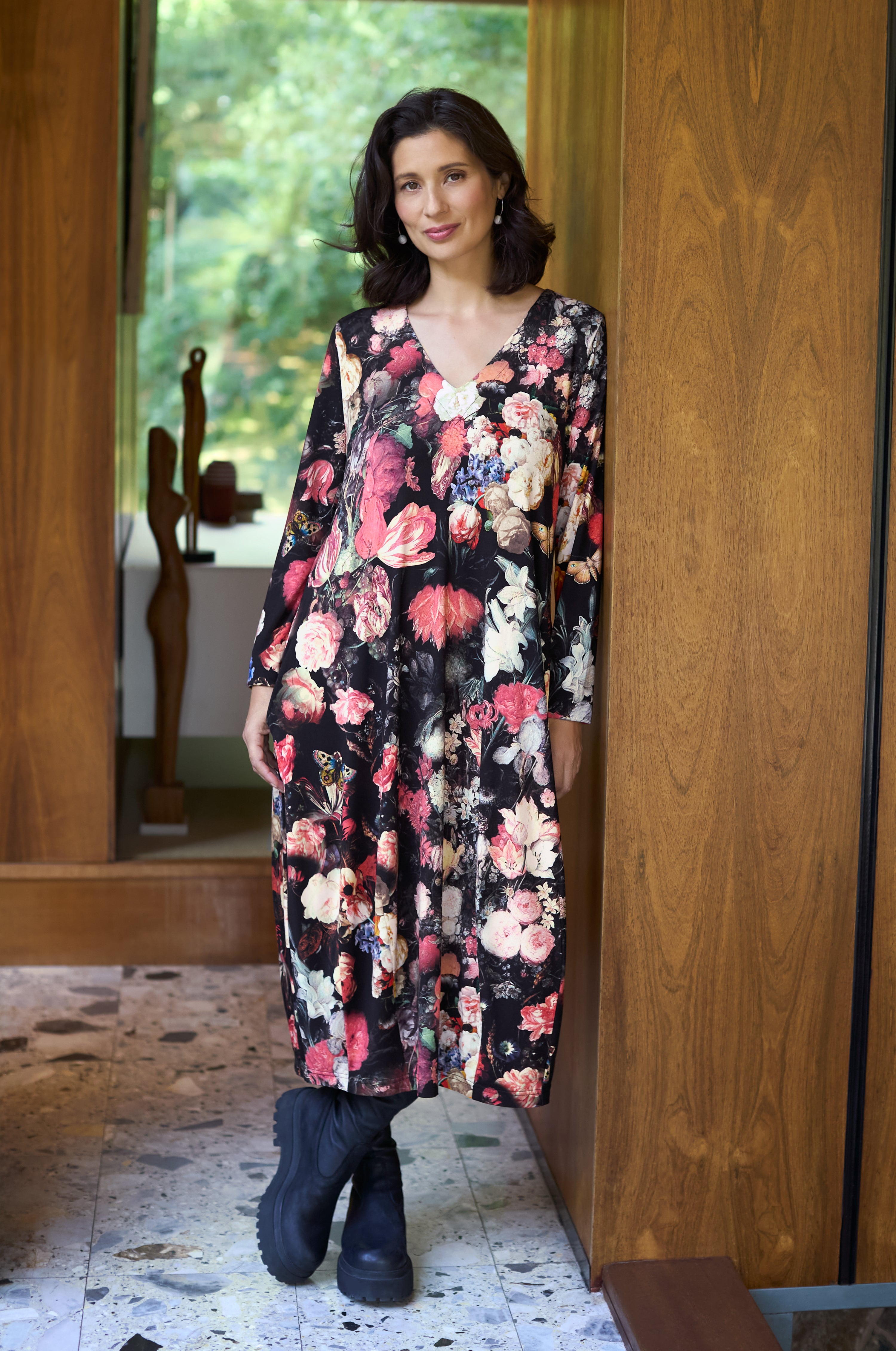 The Sahara Renaissance Floral Jersey Bubble Dress Bubble Dress reimagines a still life painting in vivid colour and form. Crafted in printed viscose jersey with added stretch for comfort, the fabric features an artistic bouquet motif that blooms across the surface like brushstrokes on canvas. The silhouette is Sahara’s signature bubble shape, created with darted hems that add sculptural volume and movement. A V-neck frames the collarbone, while full-length sleeves bring balance to the proportions.