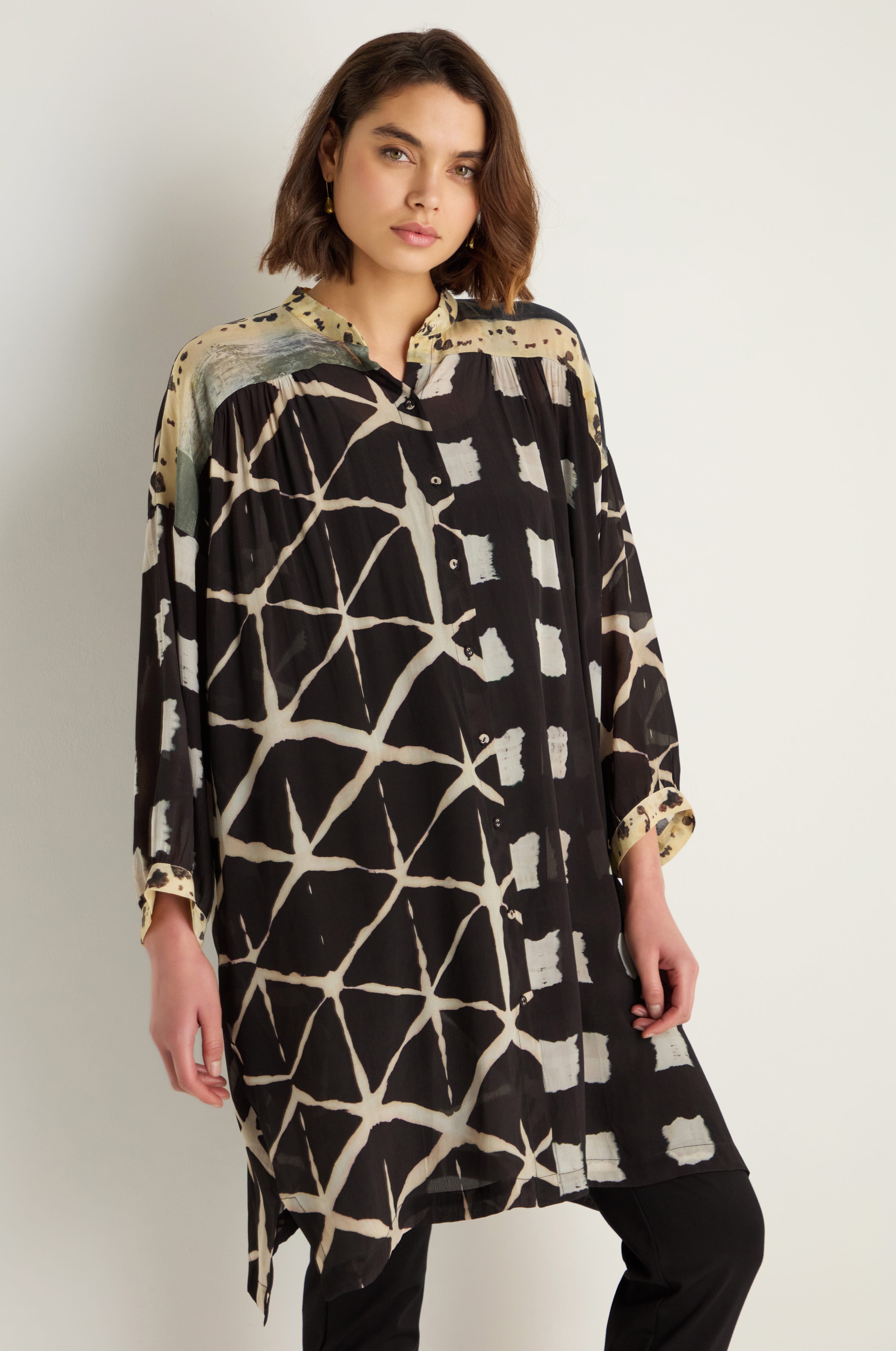 The Raga Shibori Print Long Shirt brings fluid movement and graphic contrast through a softly draped silhouette and expressive monochrome print. Cut long with effortless volume, it layers easily over trousers or can be worn open and closed as a statement piece, balancing ease with artful impact.