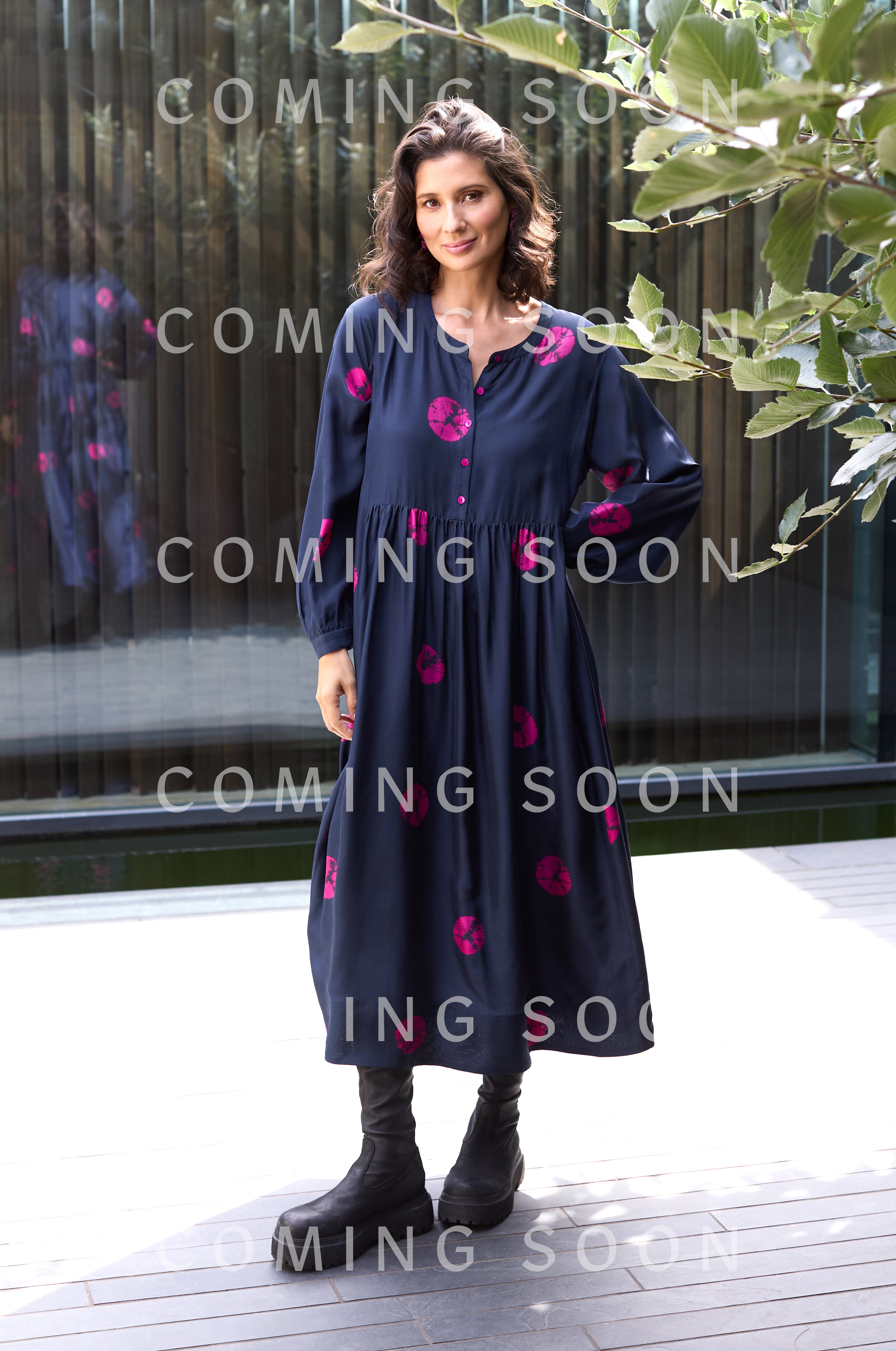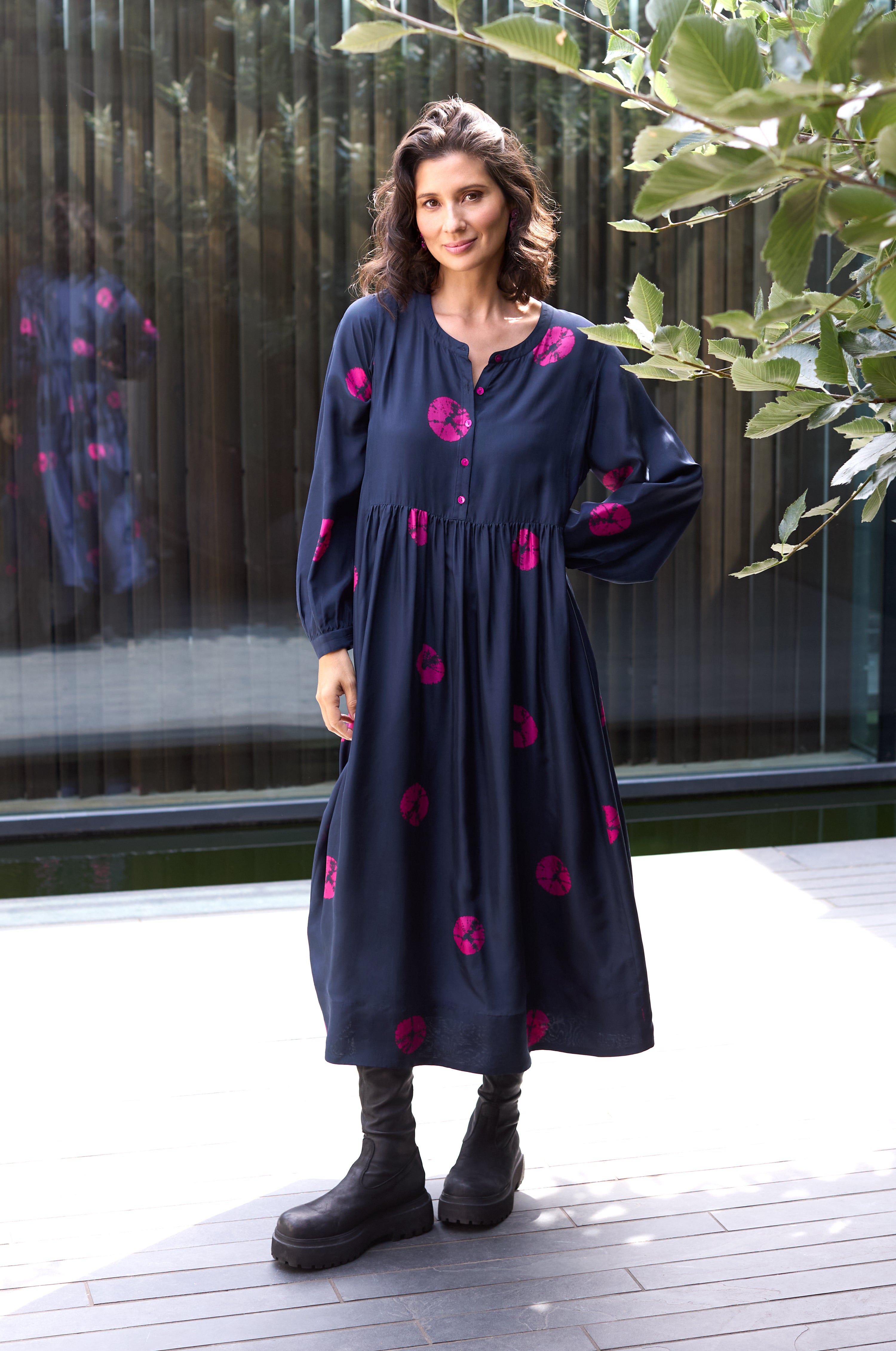 The Sahara Shibori Spot Silk Dress celebrates traditional artistry in a modern silhouette. Crafted in pure silk, the fabric carries a hand-inspired shibori spot design in night and raspberry tones. The relaxed cut, with round neckline and long sleeves, enhances the fabric’s drape and luminosity.