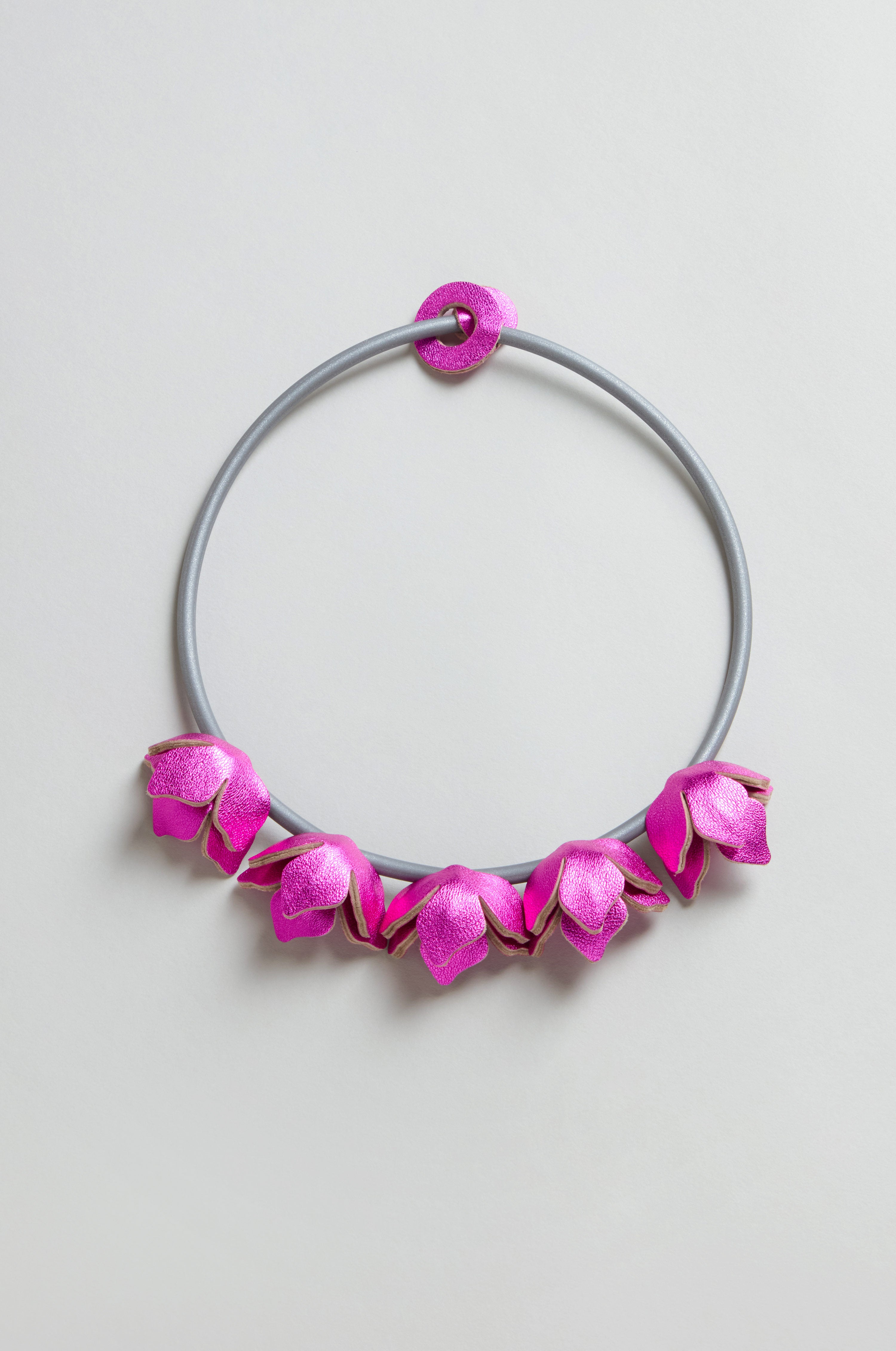 - Leather petals with a metallic fuchsia finish