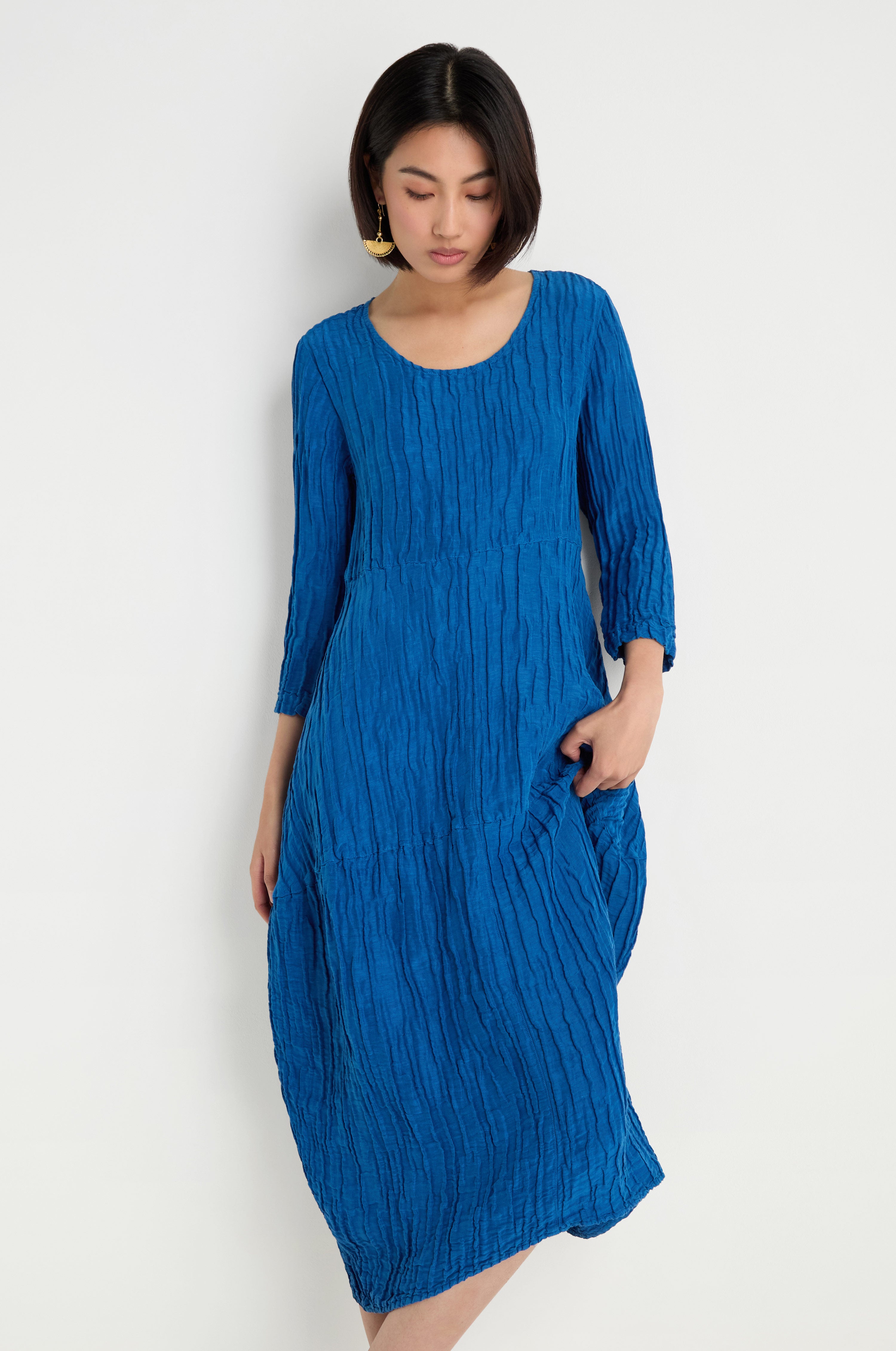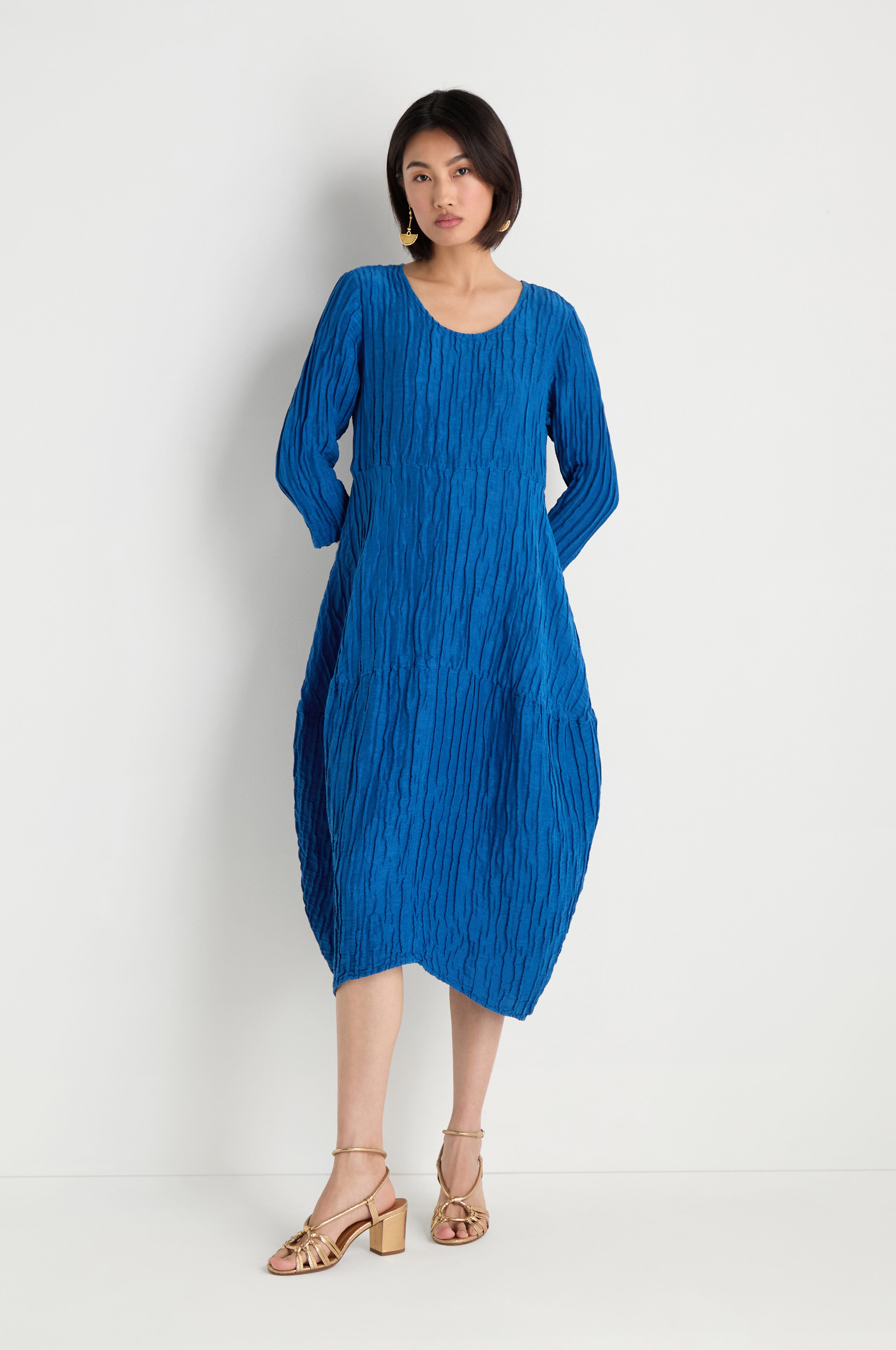The Grizas Silk Linen Bubble Dress is designed with a softly sculpted silhouette that gathers into a rounded hem. The silk and linen blend creates a fluid drape with gentle texture, while the vibrant colour makes the piece feel bold yet elegant.
