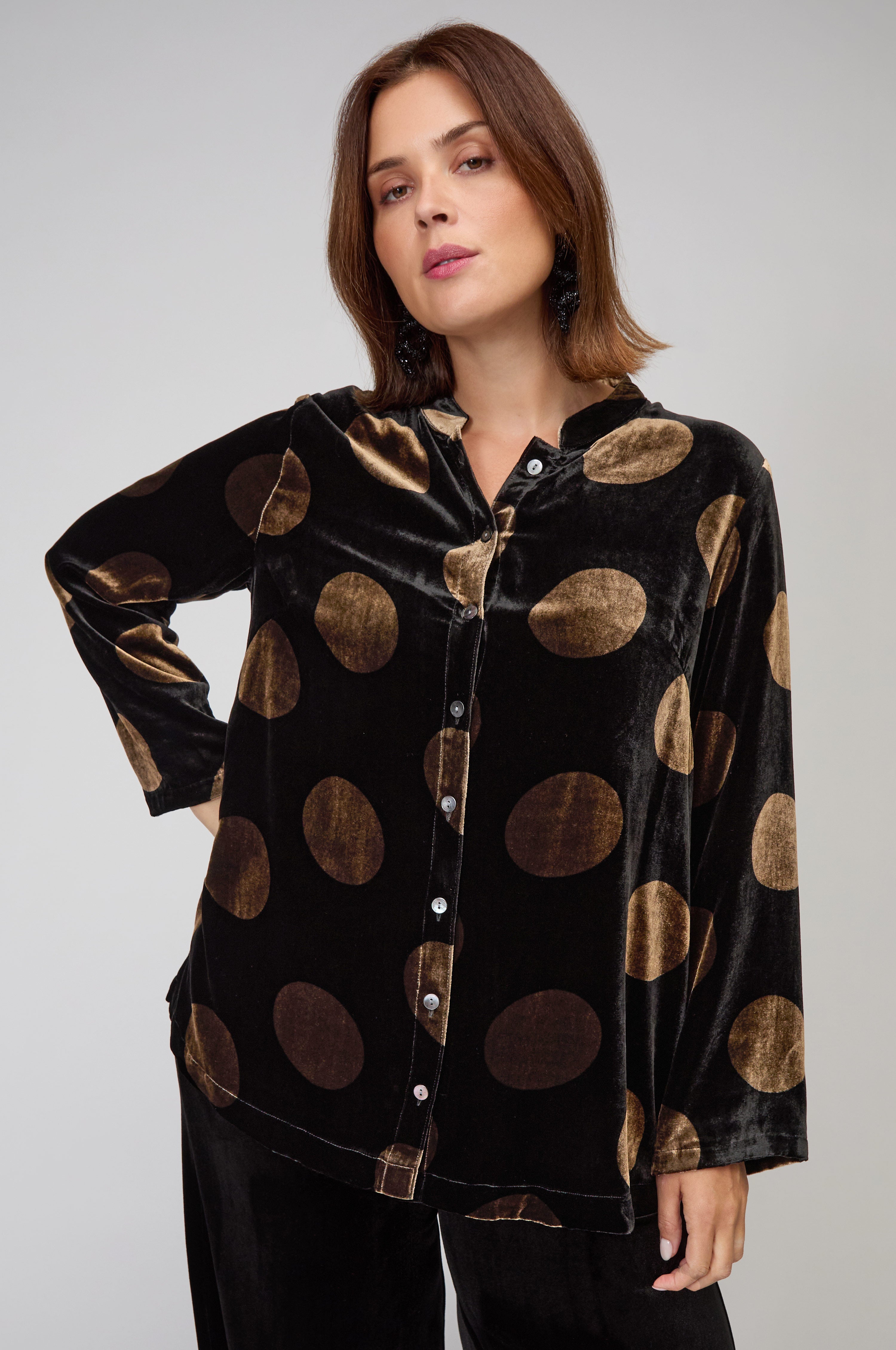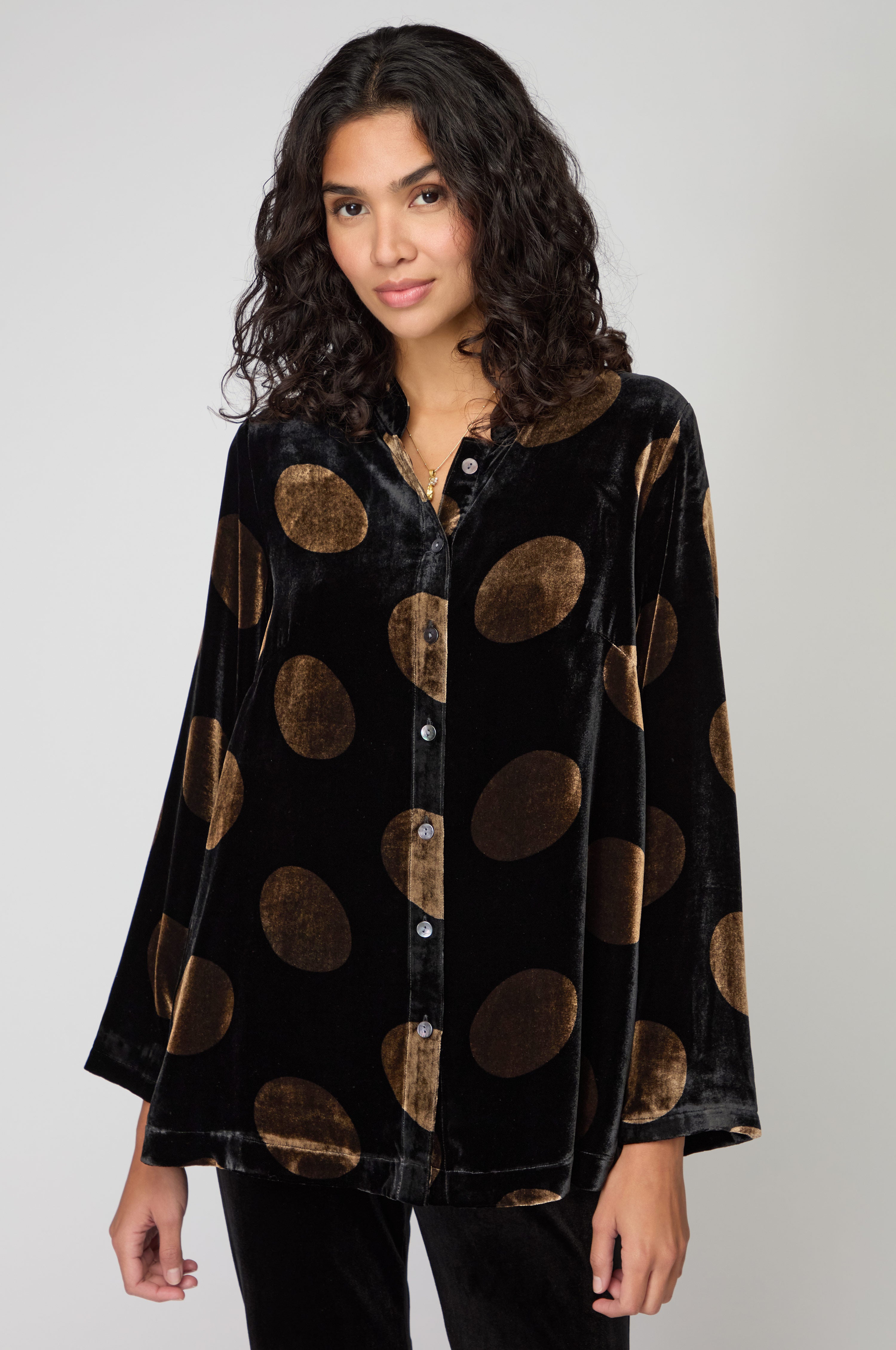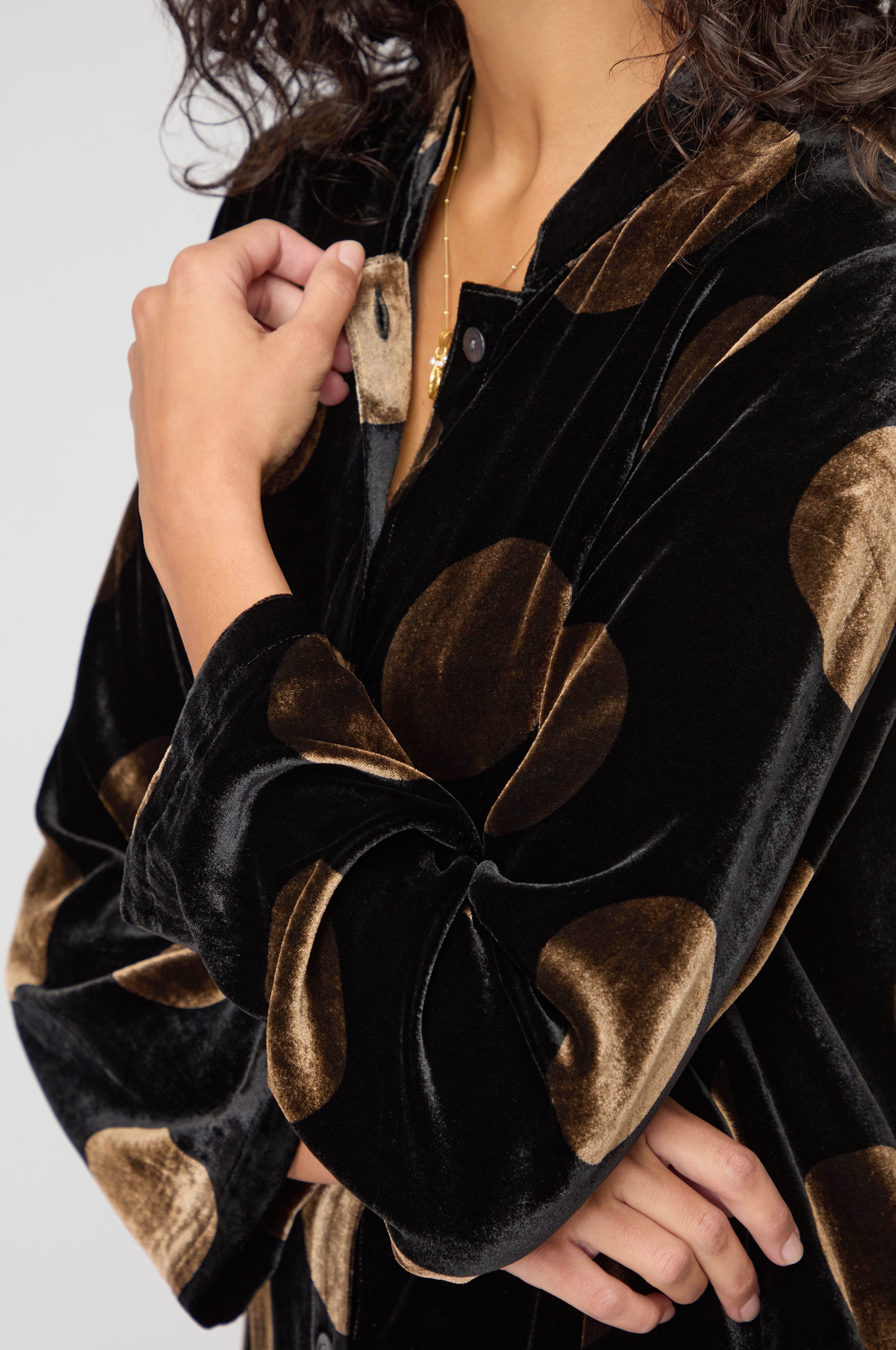The Sahara Silk Velvet Spot Shirt reimagines draped ease in a soft luxurious fabric. Cut with a button-through front, rounded stand collar, and long sleeves, its structure is softened by silk velvet. A gold spot motif enlivens the surface, giving playful movement to a timeless silhouette.