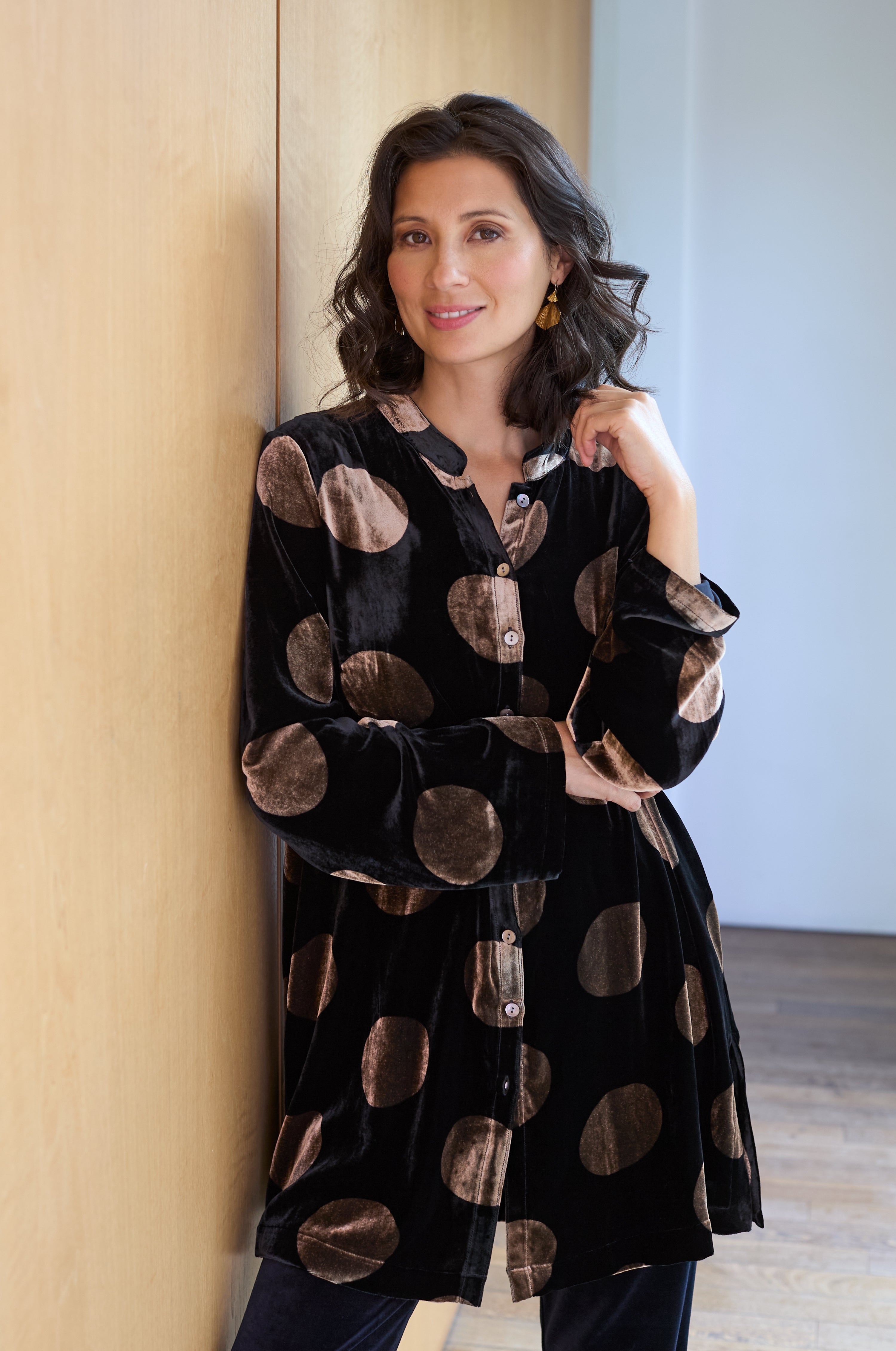 The Sahara Silk Velvet Spot Shirt reimagines tailoring in a luxurious fabric. Cut with a button-through front, sharp collar, and long sleeves, its structure is softened by silk velvet. A gold spot motif enlivens the surface, giving playful movement to a timeless silhouette.