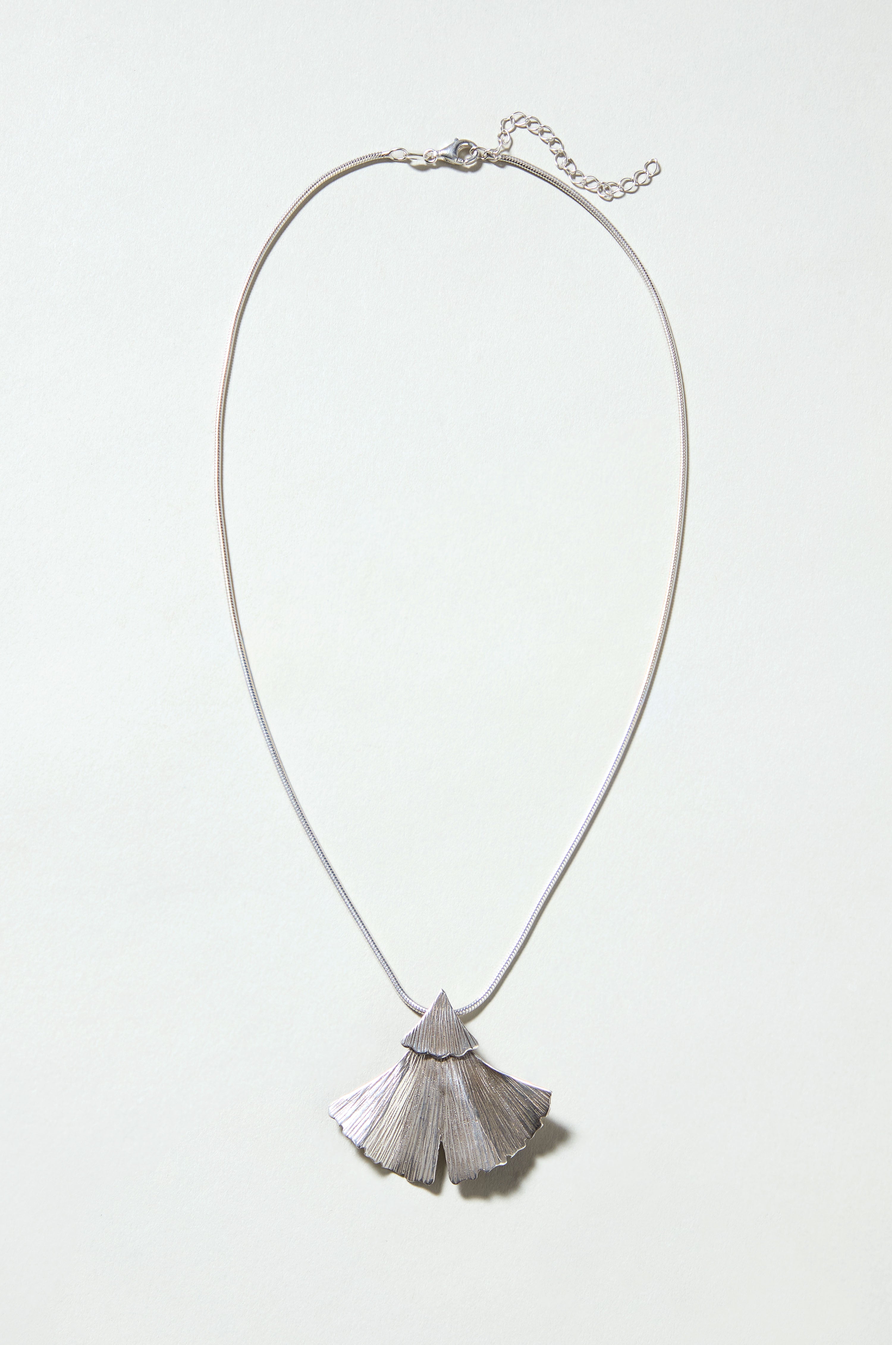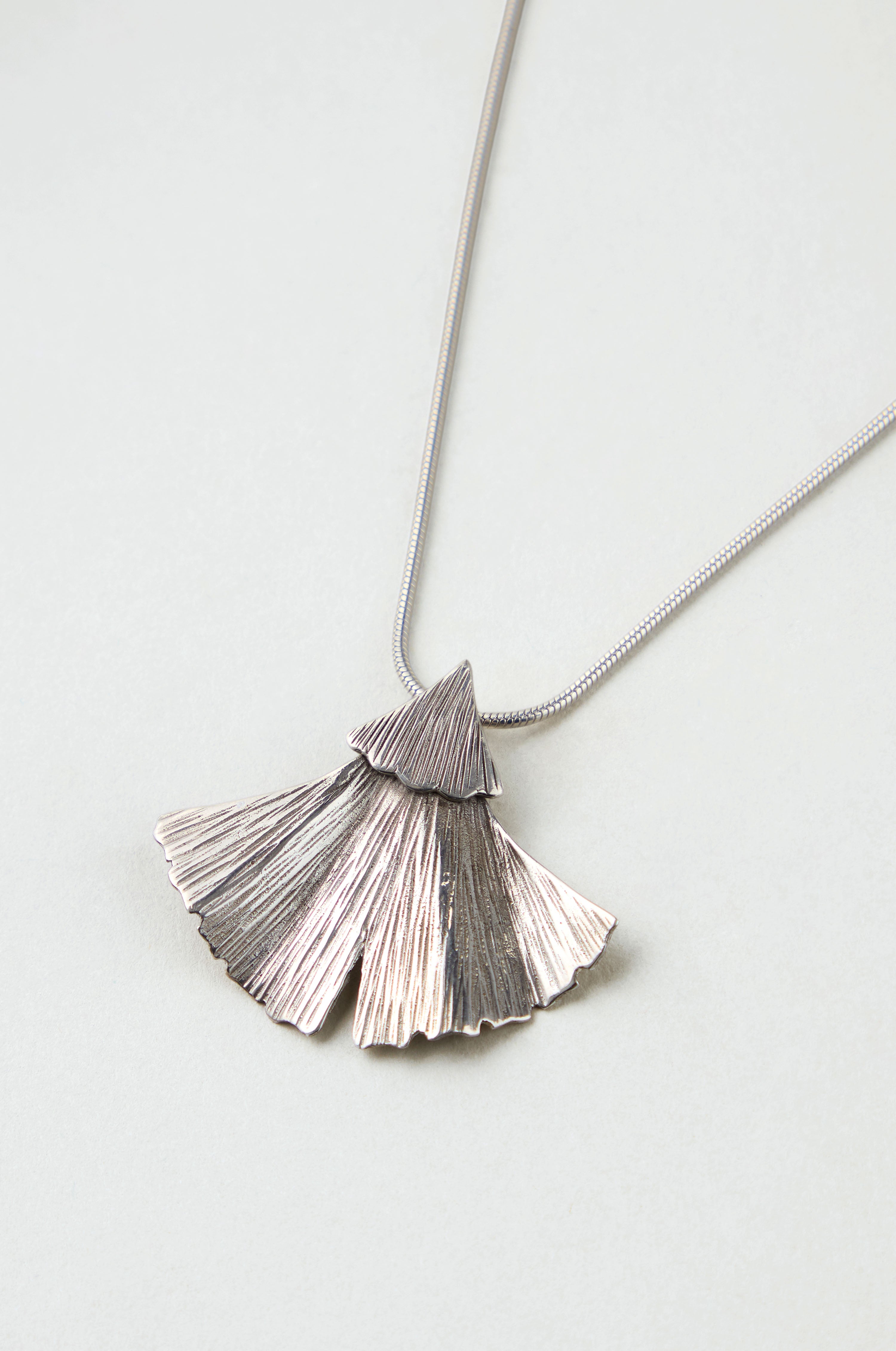 The Sahara Silver Ginkgo Leaf Pendant is crafted from sterling silver and shaped into a finely textured ginkgo motif. Its softly fanned silhouette brings subtle movement and light to everyday dressing.