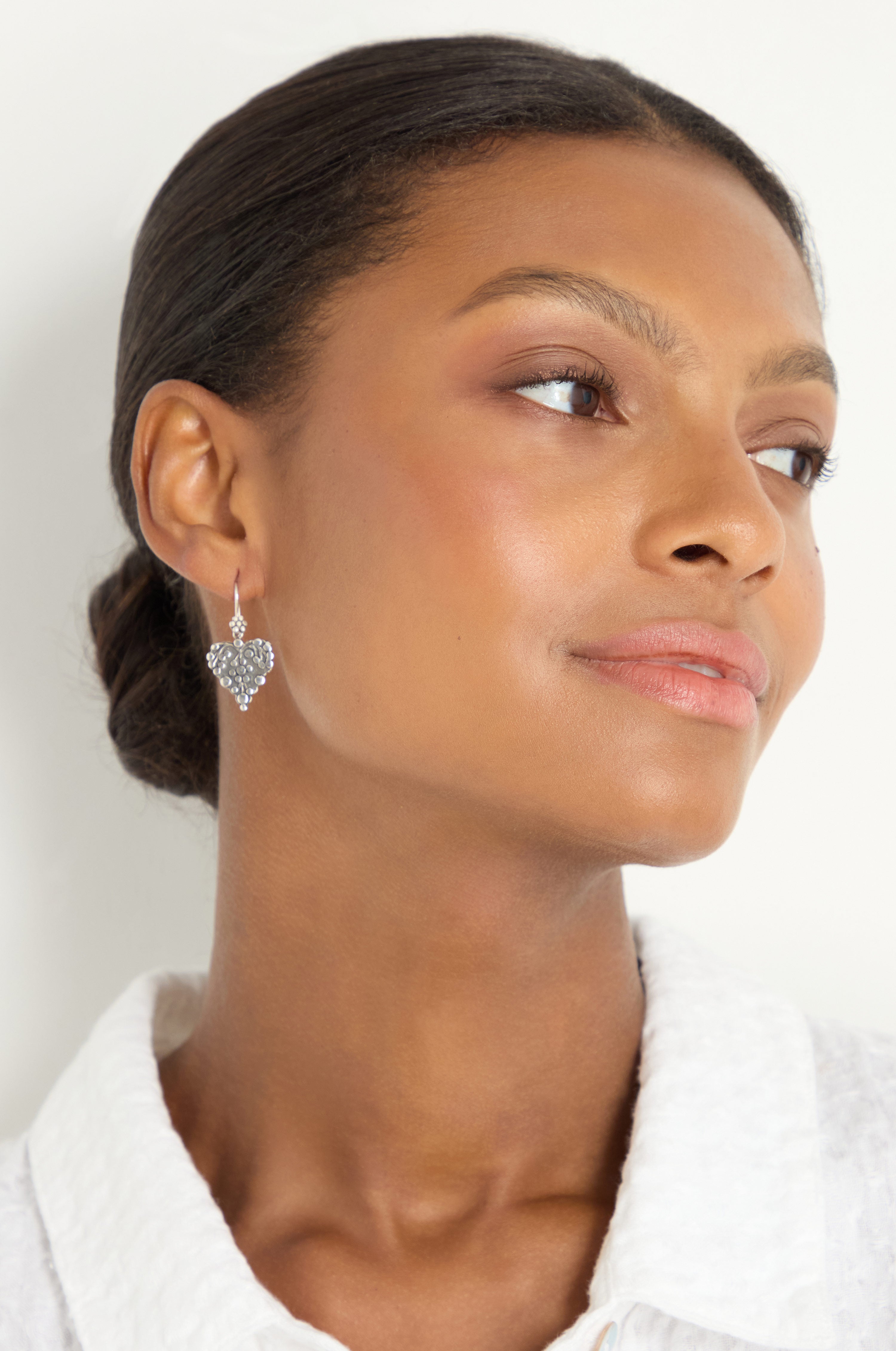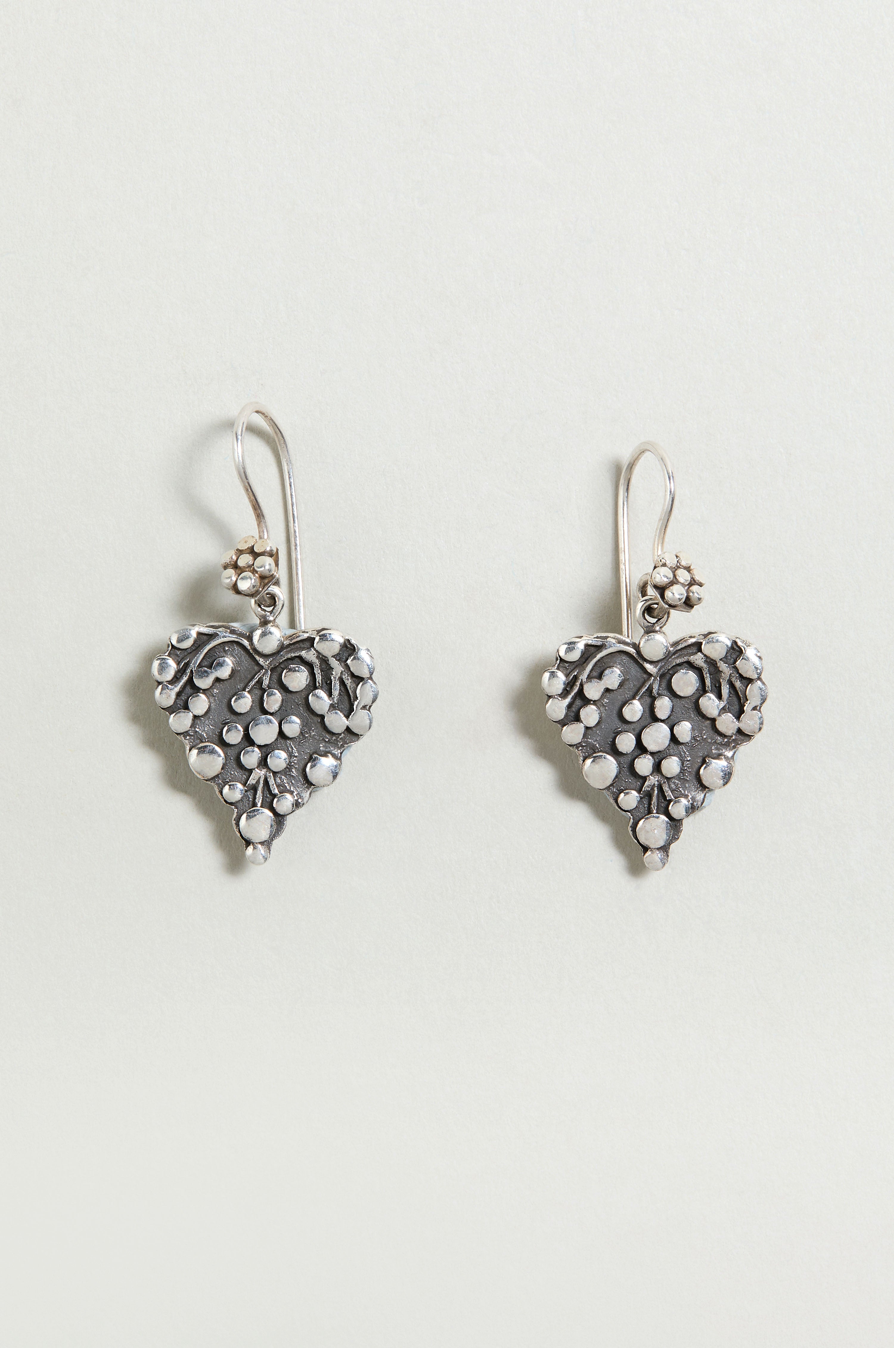 The Sahara Silver Heart Earrings are crafted in sterling silver and shaped into a softly rounded heart. Raised dot detailing adds texture and playful light reflection, giving this classic motif a subtle lift.