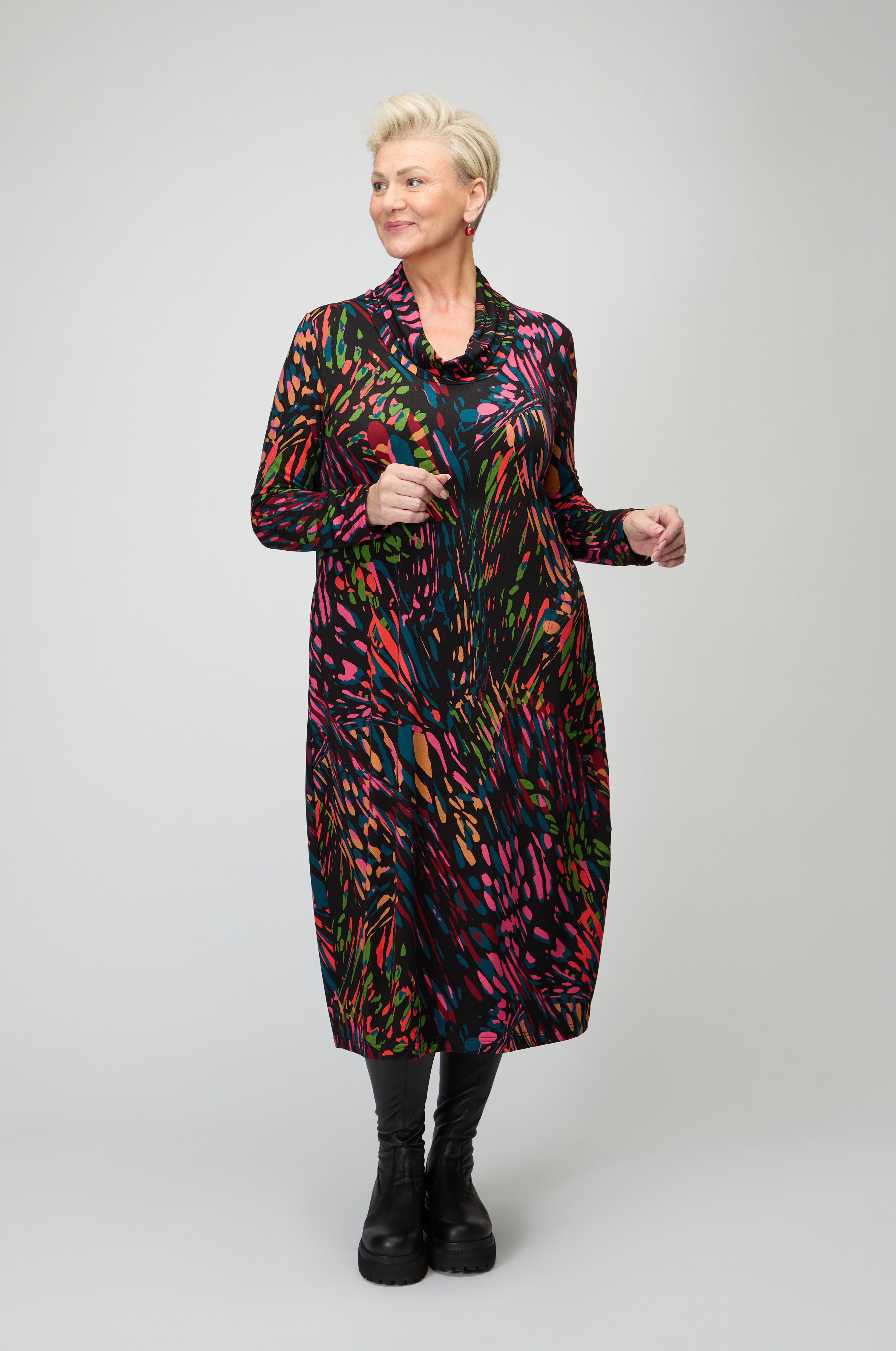 The Sahara Skyfire Jersey Dress is a statement piece designed in a vibrant abstract print that flickers with fiery tones against a dark base. Crafted in the UK from soft Lenzing™ EcoVero™ jersey with a touch of stretch, this dress combines sustainability with comfort. The bubble silhouette features a cowl neckline, full-length sleeves and side pockets, creating both practicality and a distinctive shape.