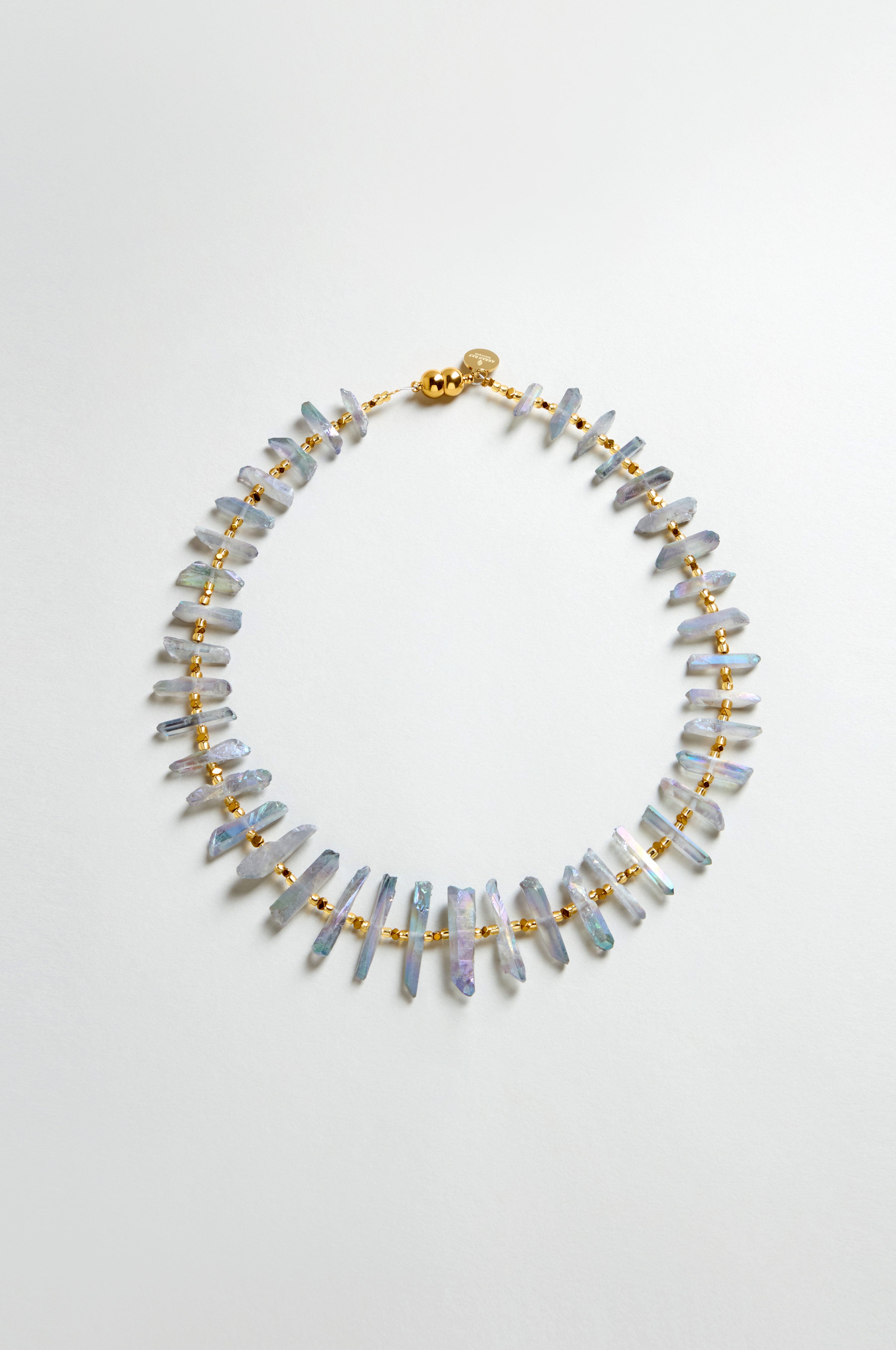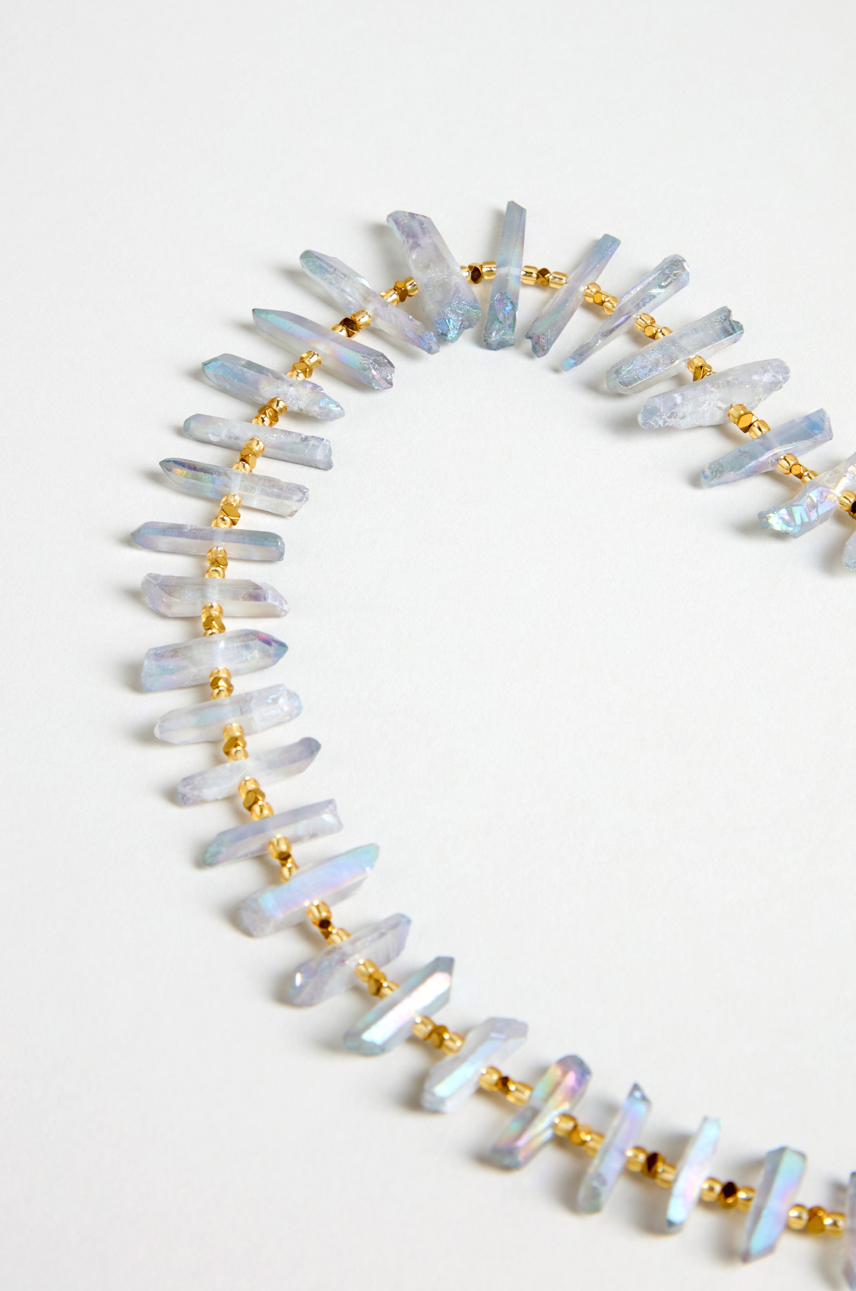 The Arran Bay Slate Quartz Necklace has an organic textural feel, with irregular quartz slices that create a natural rhythm around the neckline. Each piece reflects light slightly differently, giving the necklace depth and a statement quality that sits beautifully with the warm gold.