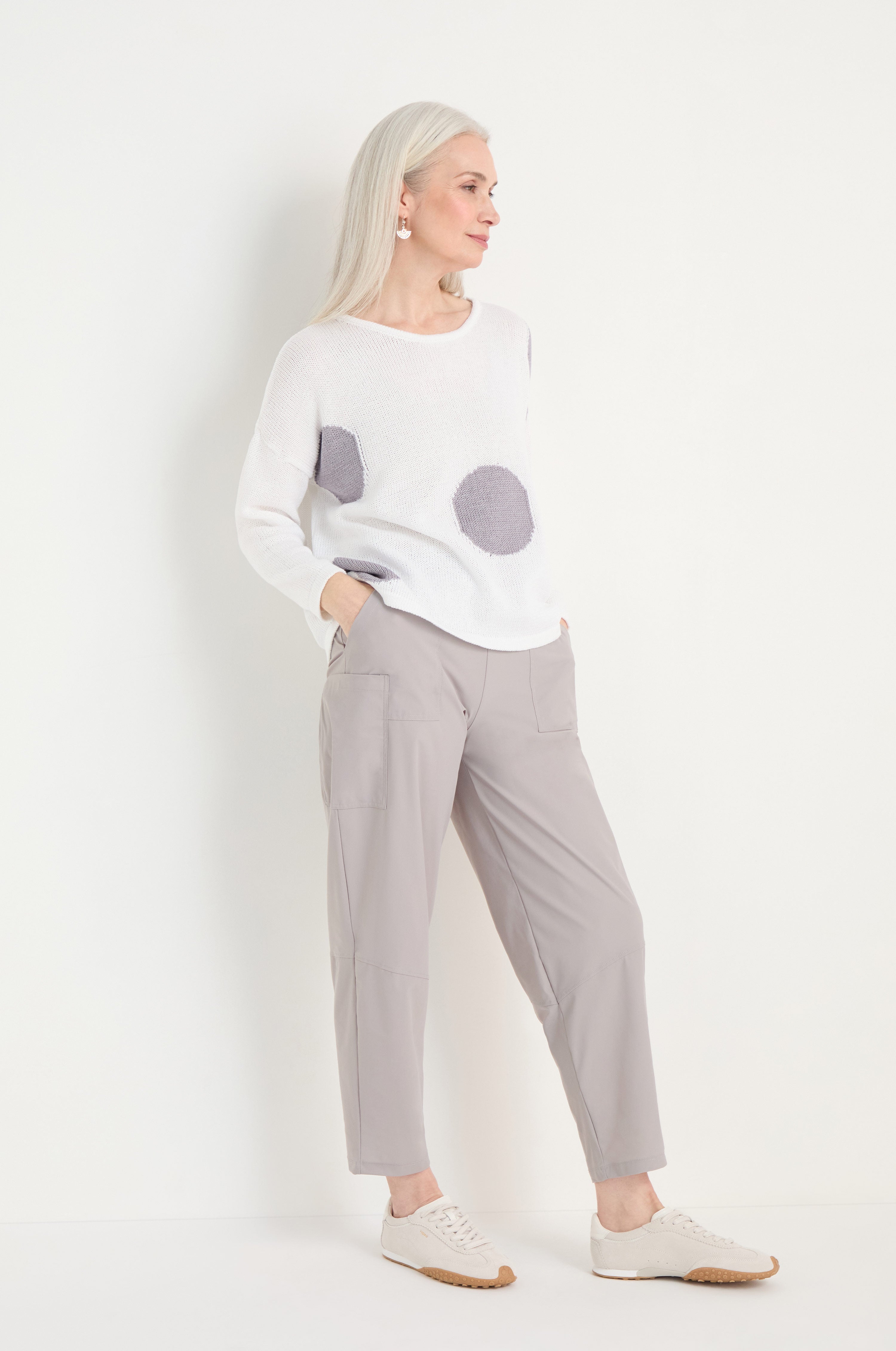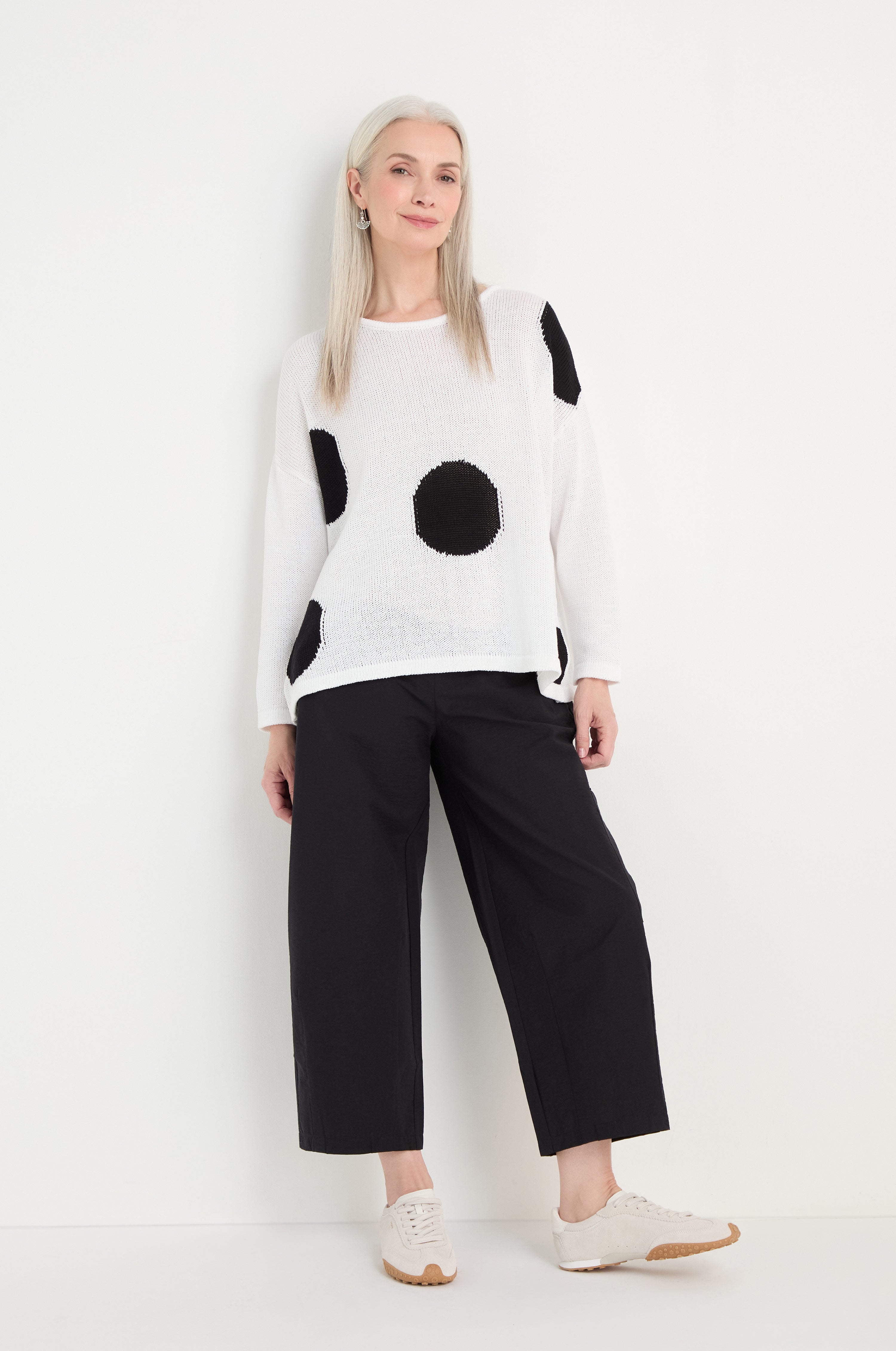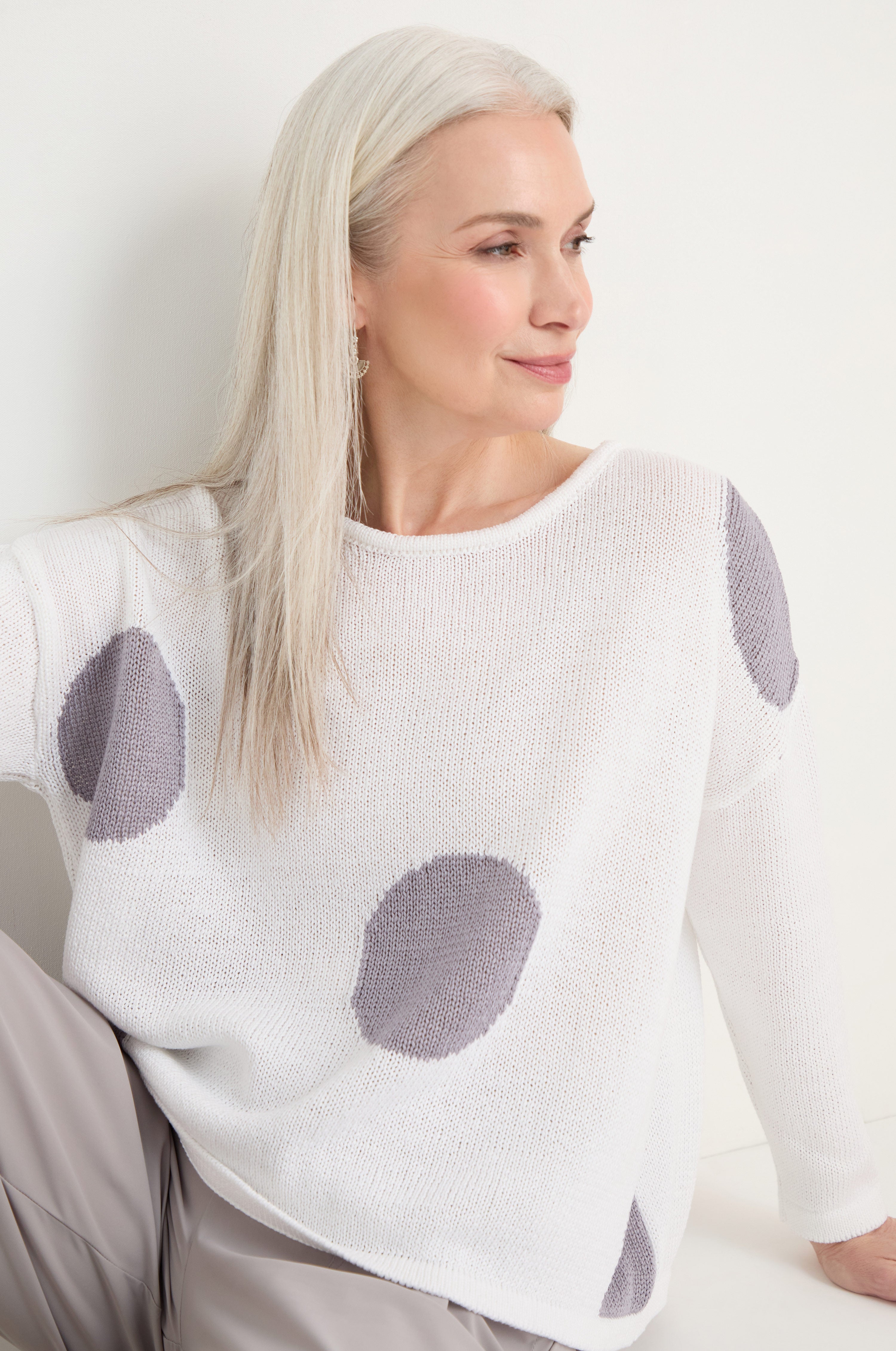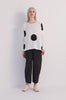 The Naya Spot Cotton Knit balances soft texture with bold pattern, creating a piece that feels both playful and considered. The organic cotton knit offers a breathable, comfortable feel while the oversized spot design adds visual impact.