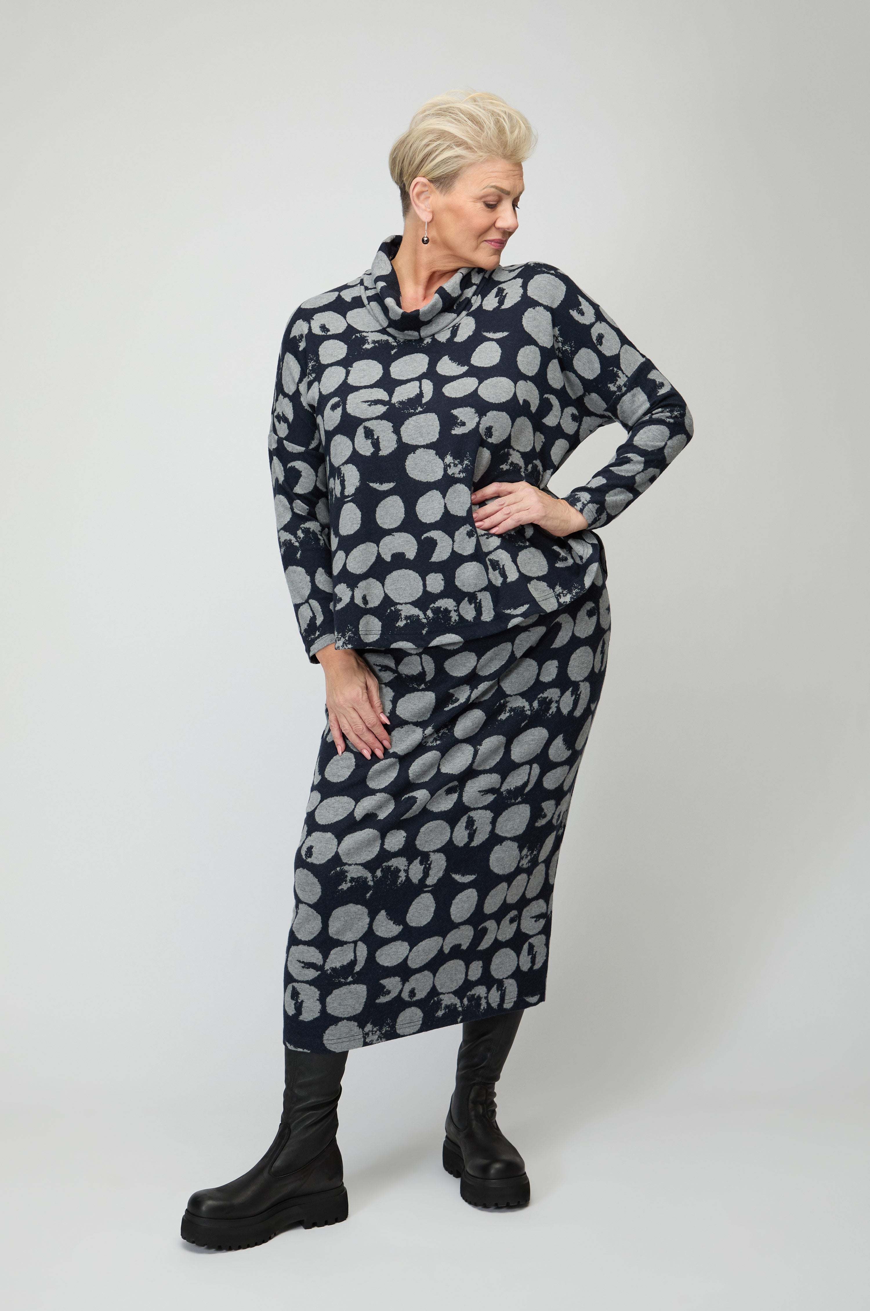 The Sahara Textured Brushed Spot Jersey Boxy Top is designed for ease and tactility. In brushed jersey with a warm soft handle, it features full length sleeves, a curved hem with side opening, and a relaxed cowl neckline. The boxy cut creates a modern silhouette, balanced by the playful all over spot motif.