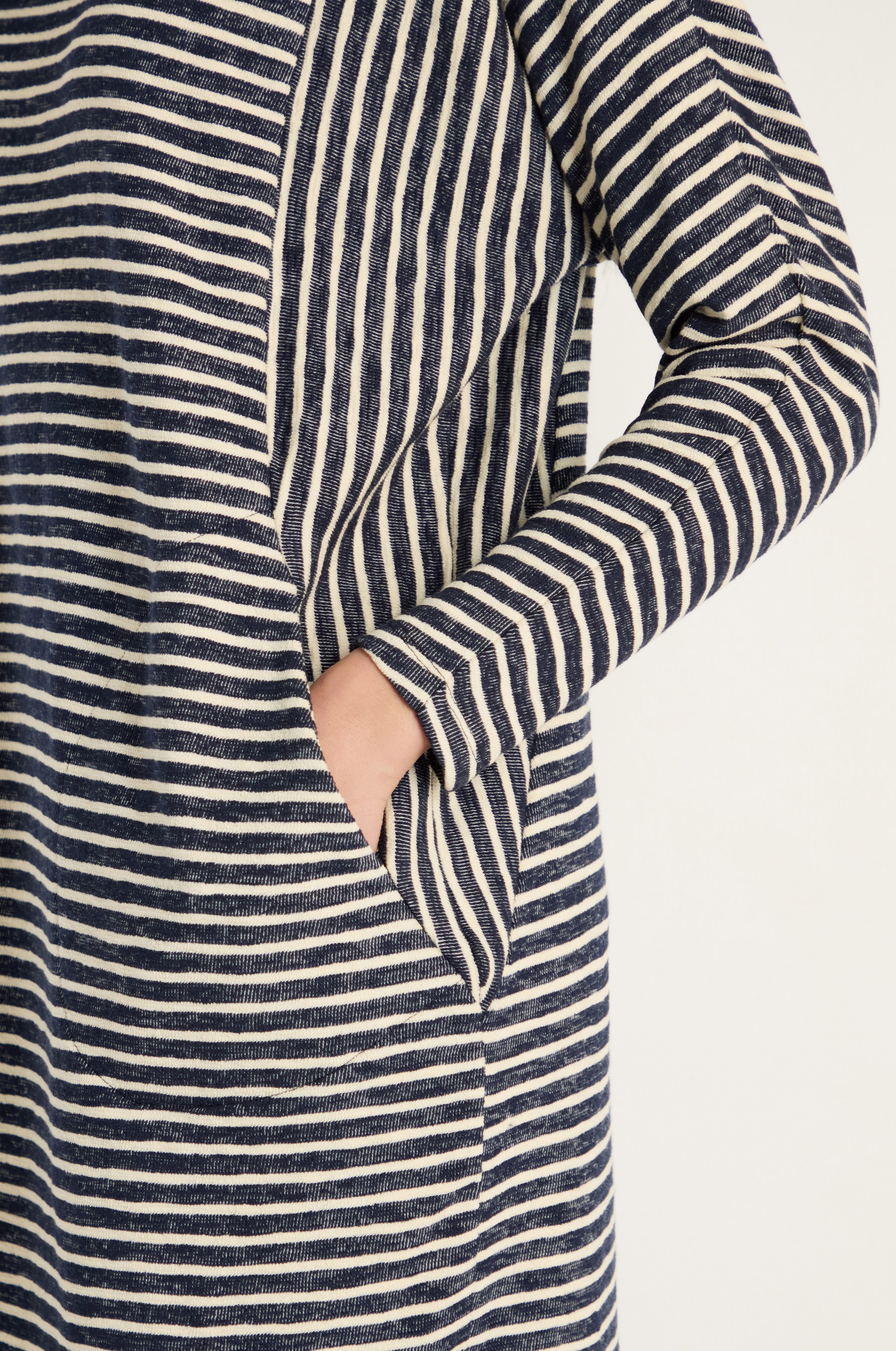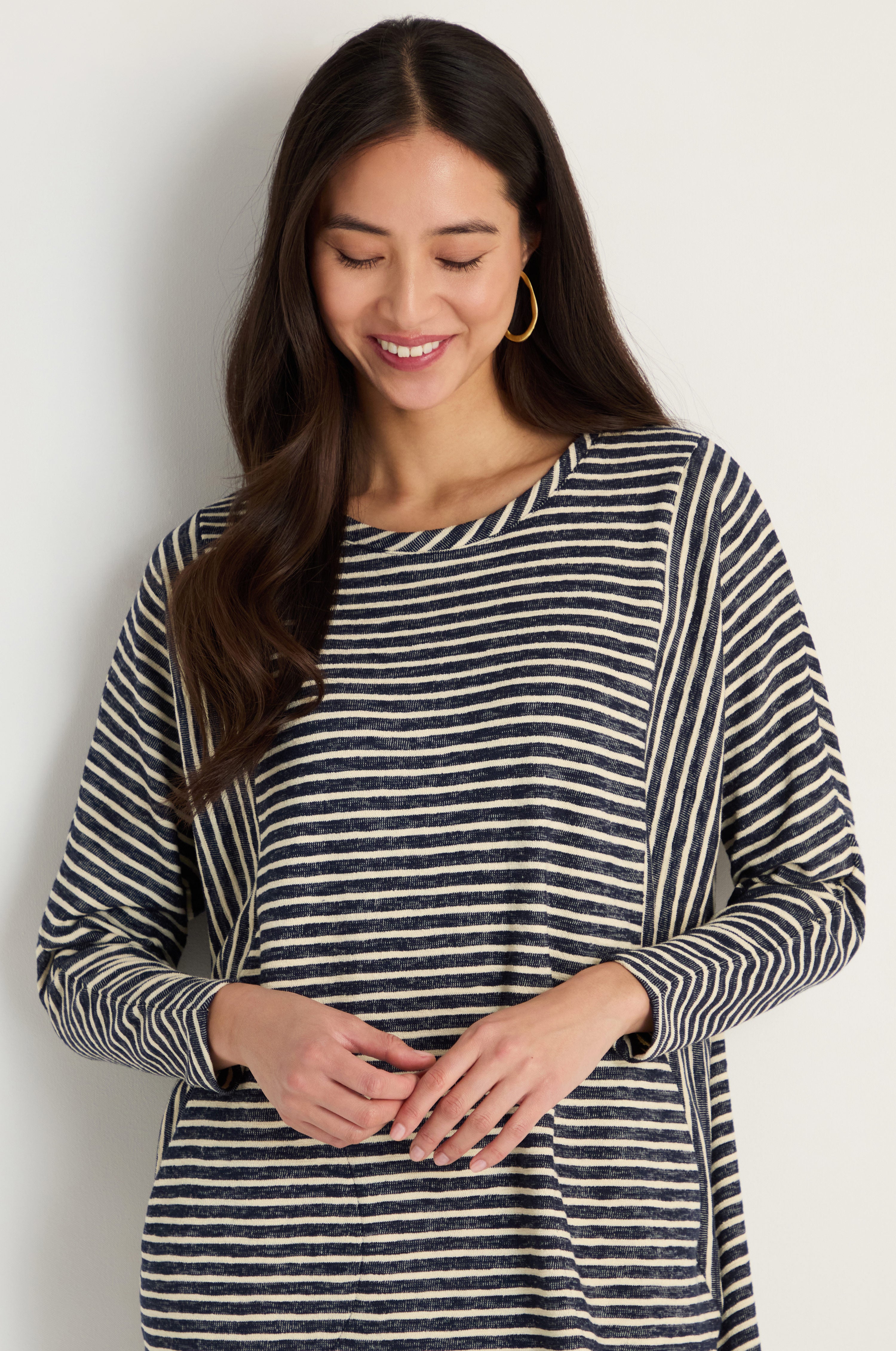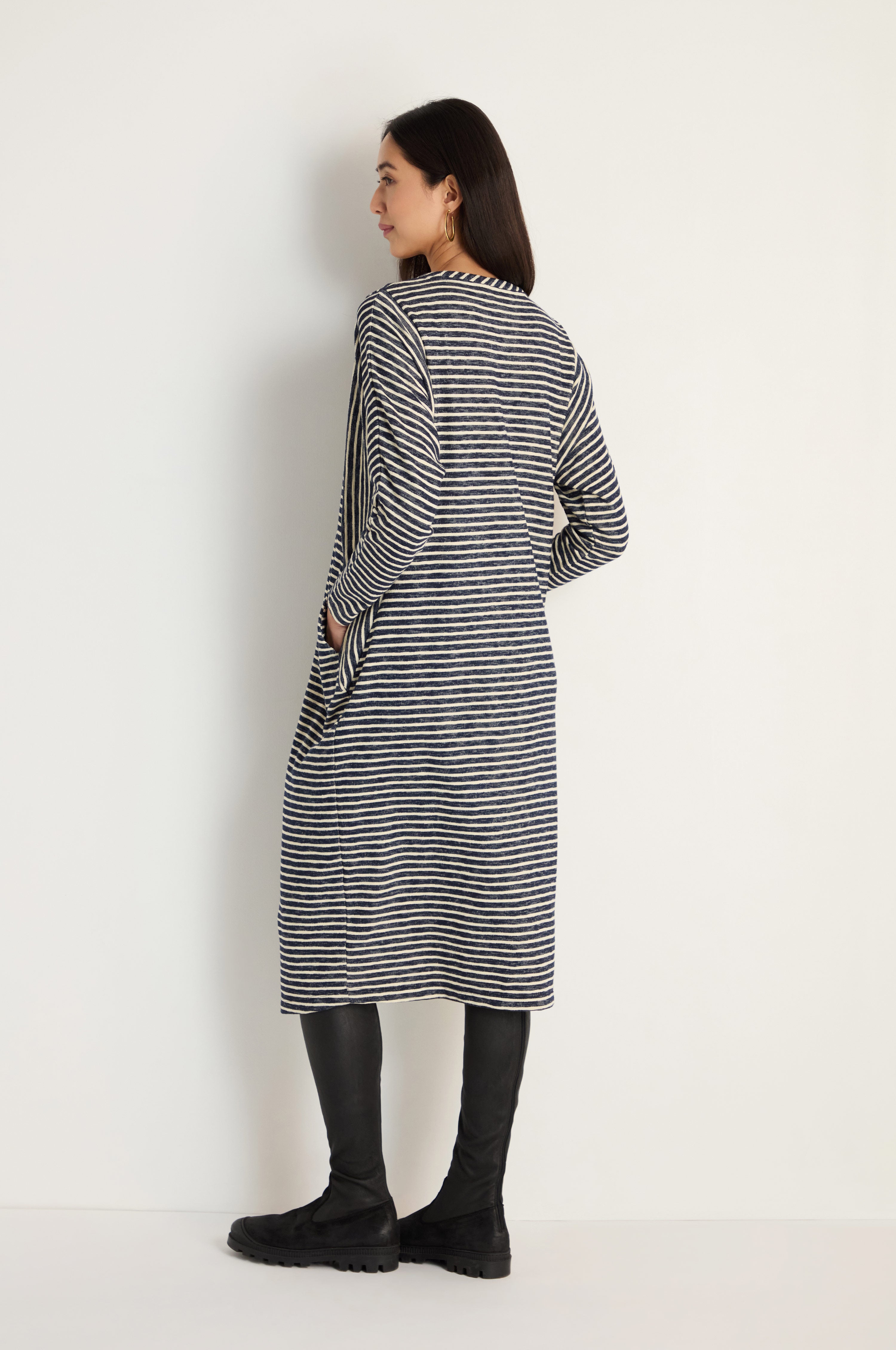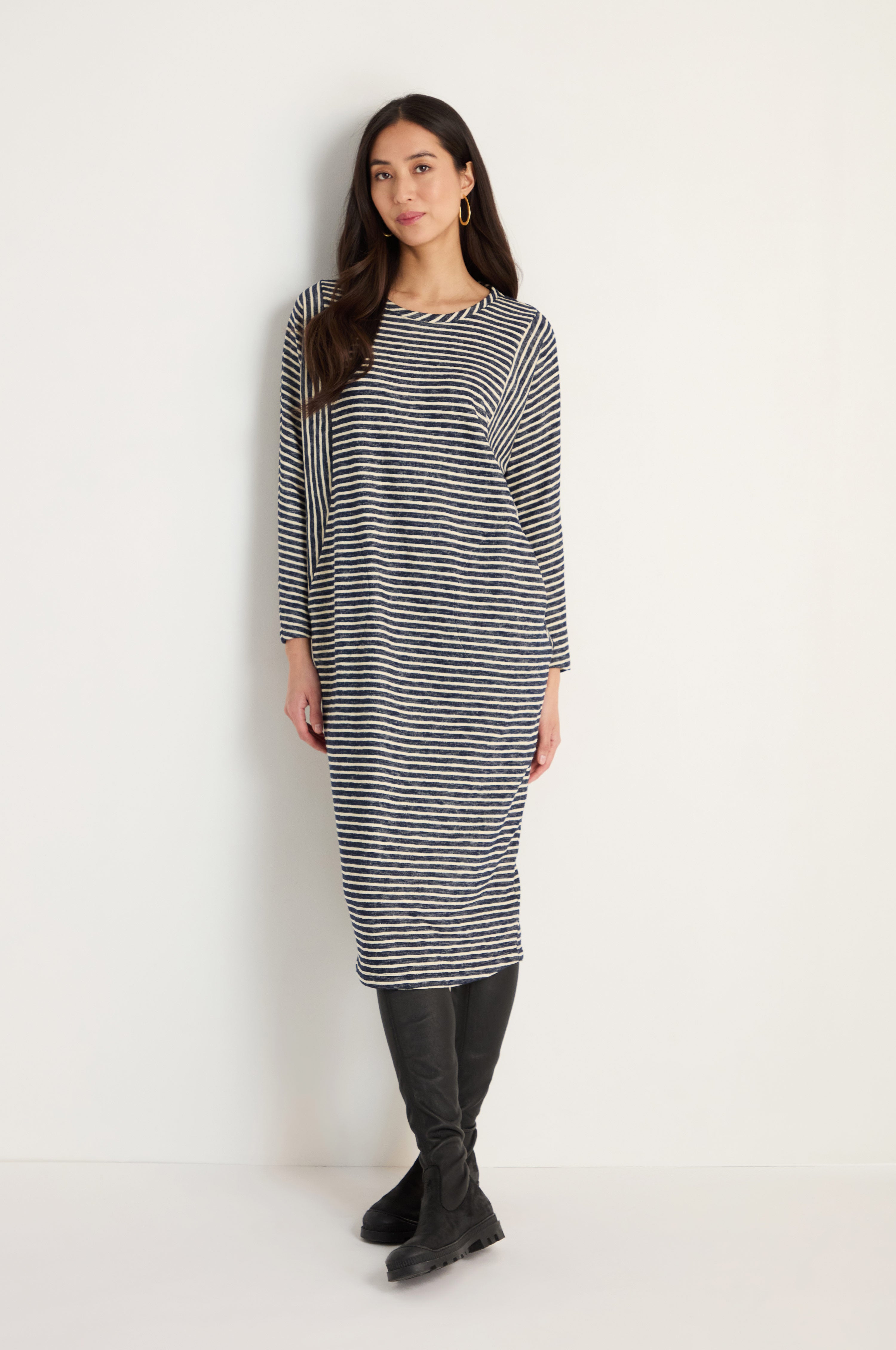 The Sahara Textured Stripe Jersey Dress is a clean, straight cut style that balances ease with thoughtful design details. Subtle panel seams and contrasting stripe placement add depth to an otherwise simple silhouette.