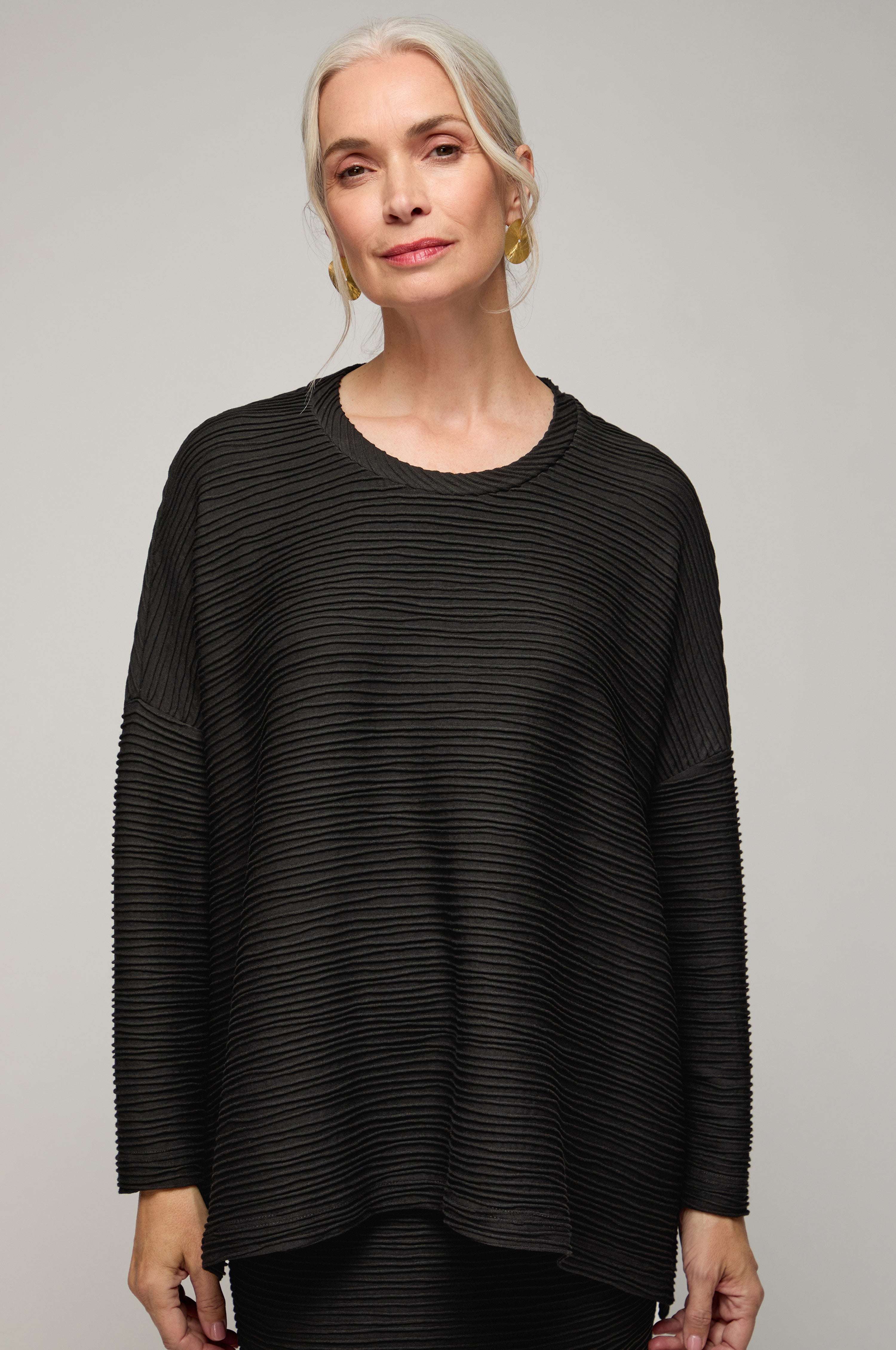 The Sahara Textured Wave Jersey Boxy Top is cut from pleat-effect viscose jersey with natural stretch, creating a rippled surface that brings subtle dimension to classic black. The oversized boxy silhouette drapes fluidly on the body, while the scoop neckline softens the shape and full-length sleeves add balance. The design is finished with clean lines that highlight the fabric’s texture, making it an easy yet striking piece.