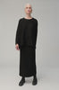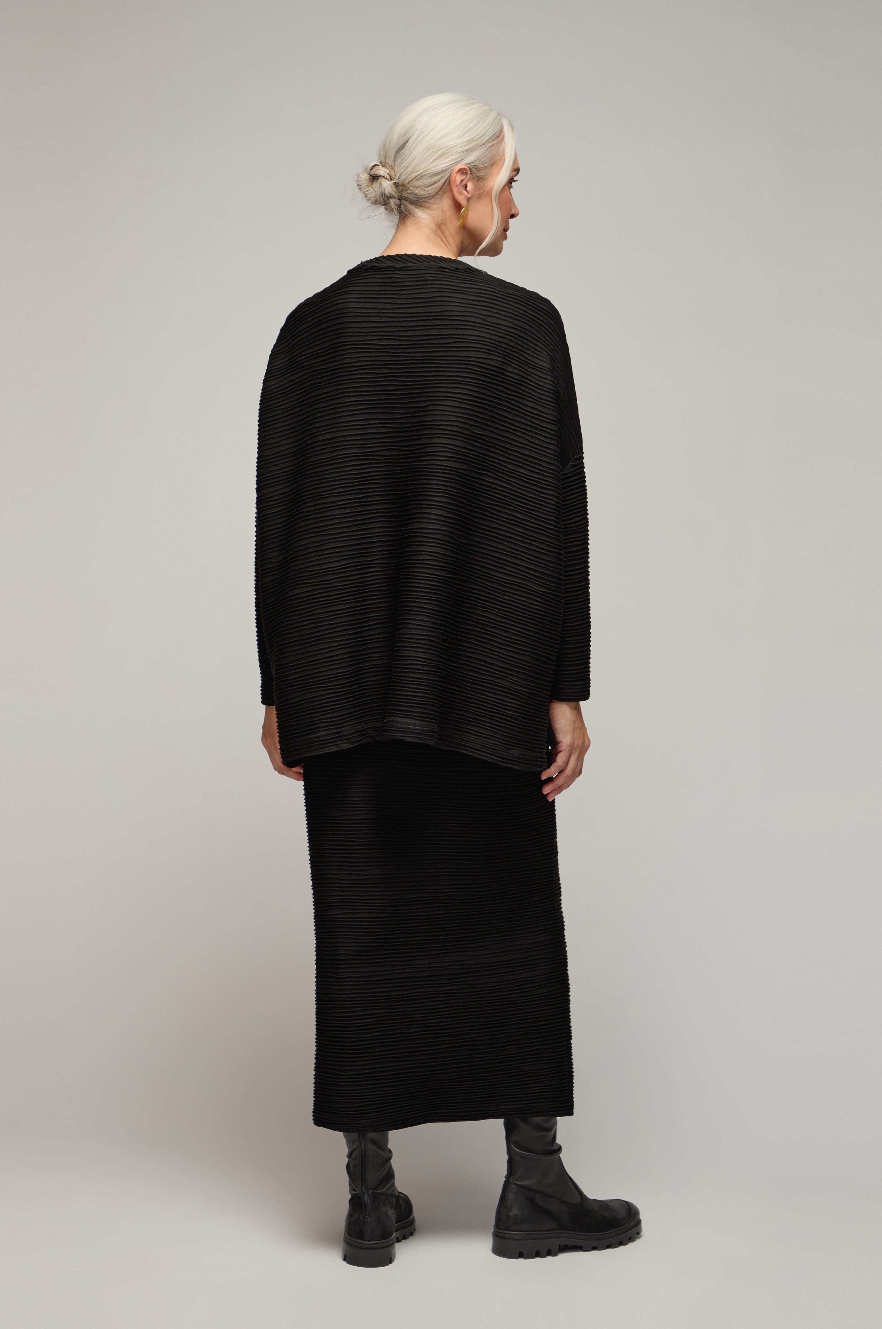 Person wearing a Textured Wave Jersey Tube Skirt with a matching top and black boots, standing confidently against a plain background, one hand on their hip. A woman with gray hair, wearing a black Textured Wave Jersey Tube Skirt and matching top with black boots, stands smiling with her hands on her hips against a plain background.