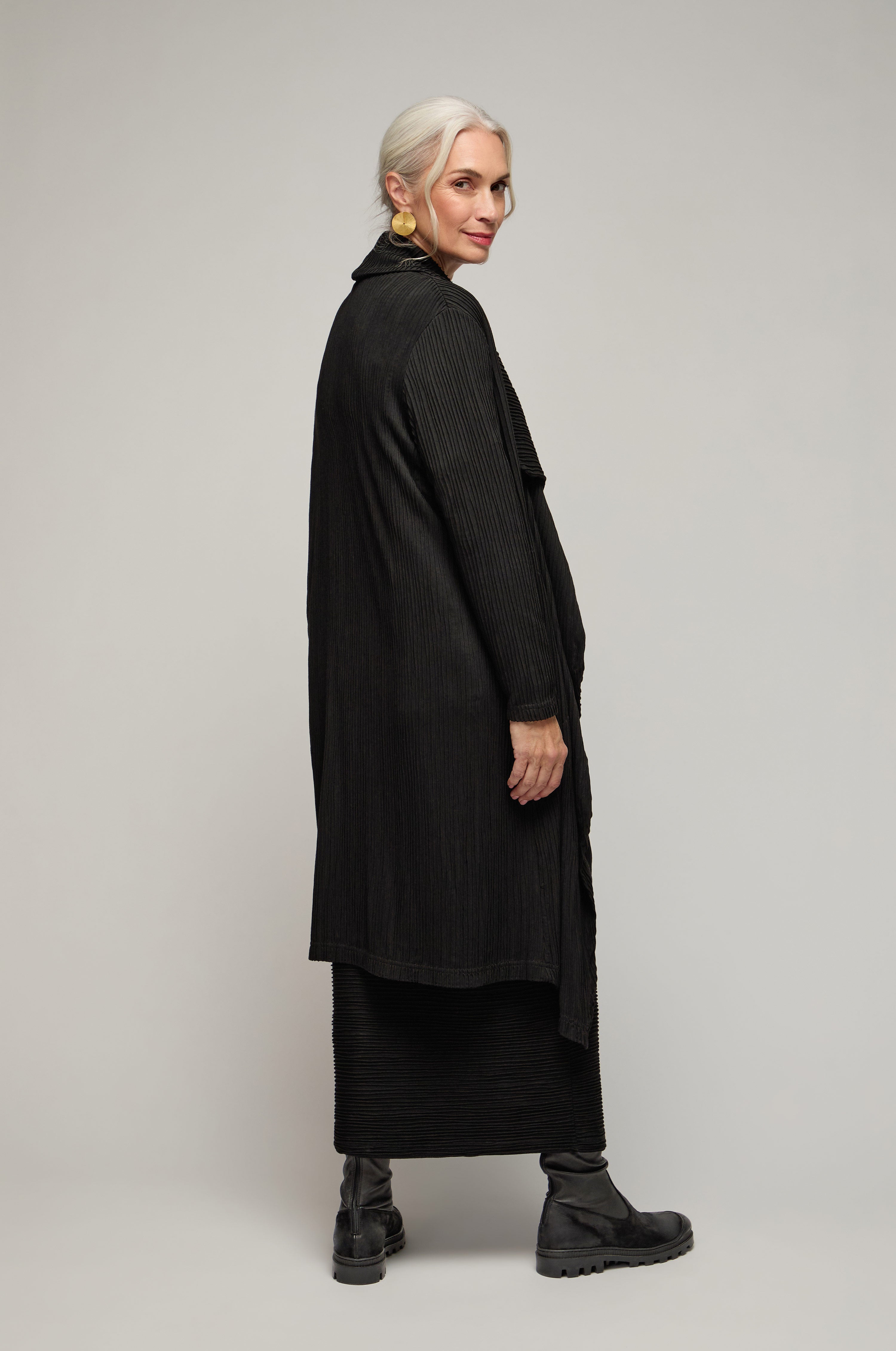 The Sahara Textured Wave Jersey Wrap Coat reimagines outer layering in sculptural jersey. Crafted in pleat-effect viscose jersey, the fabric has a wave-like surface that brings depth and tactility to the oversized cut. A longline silhouette is shaped with an asymmetric hem, while the waterfall cowl collar cascades in soft folds. Full-length sleeves enhance its generous proportions, making it both dramatic and wearable.