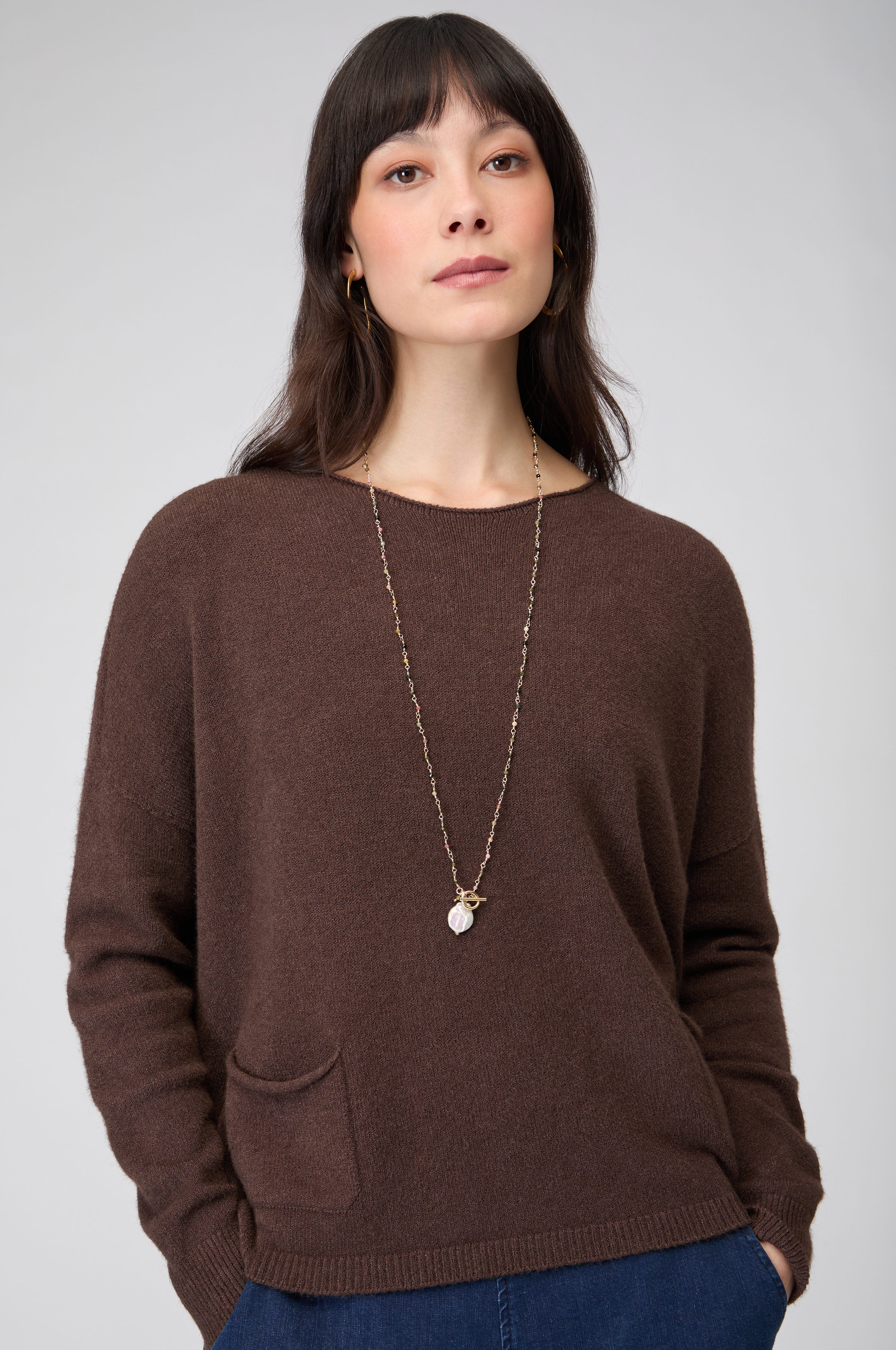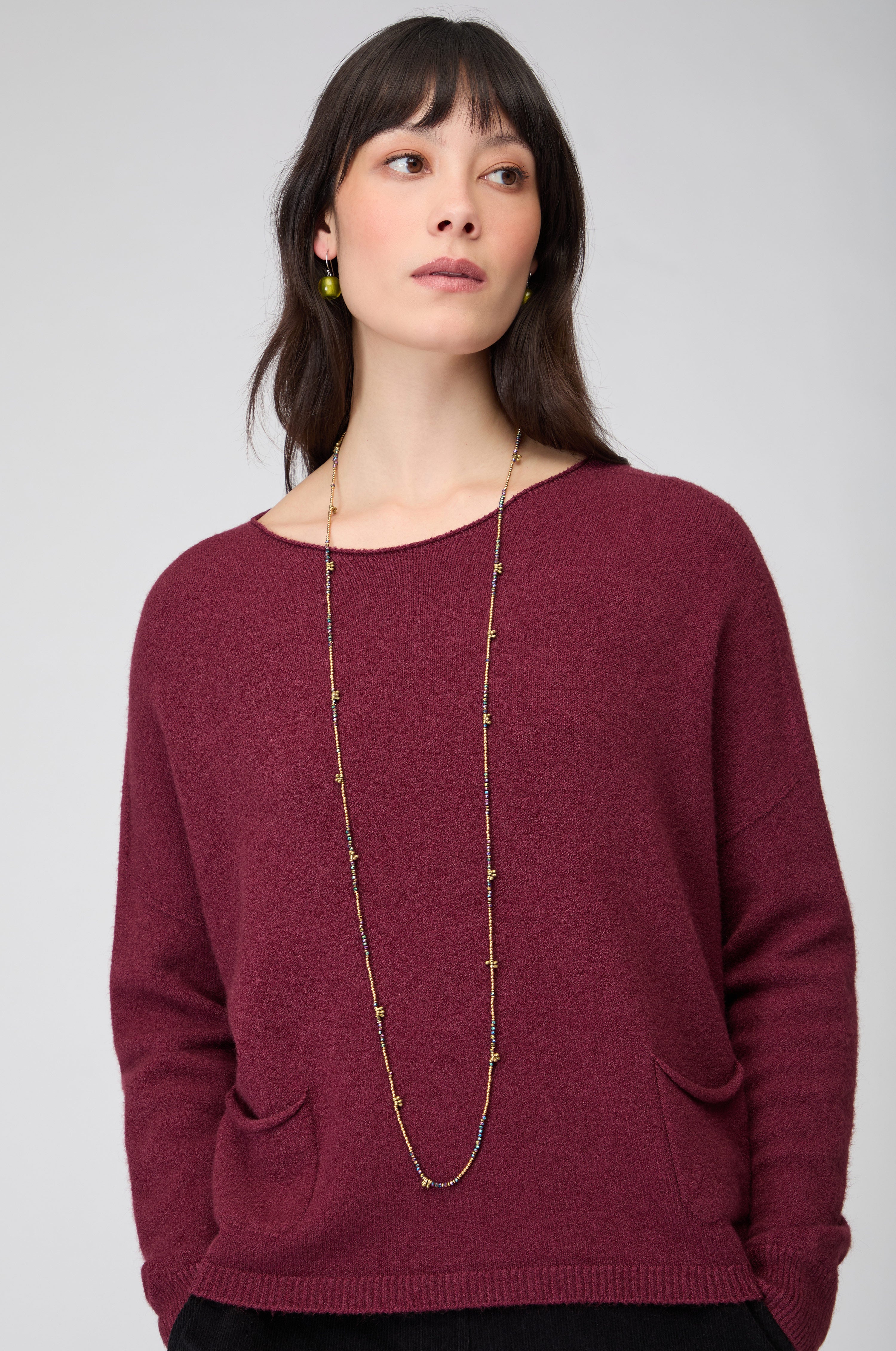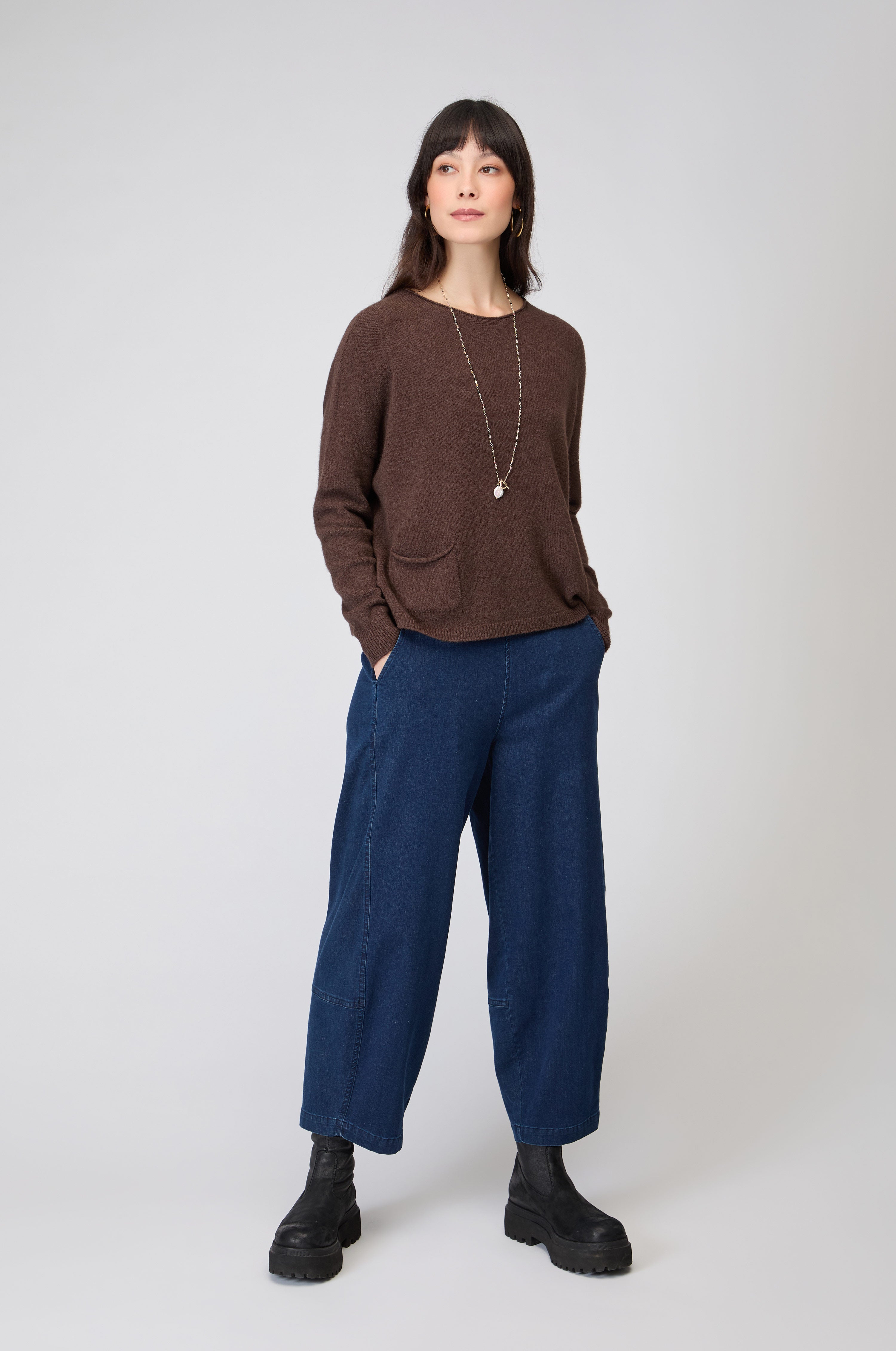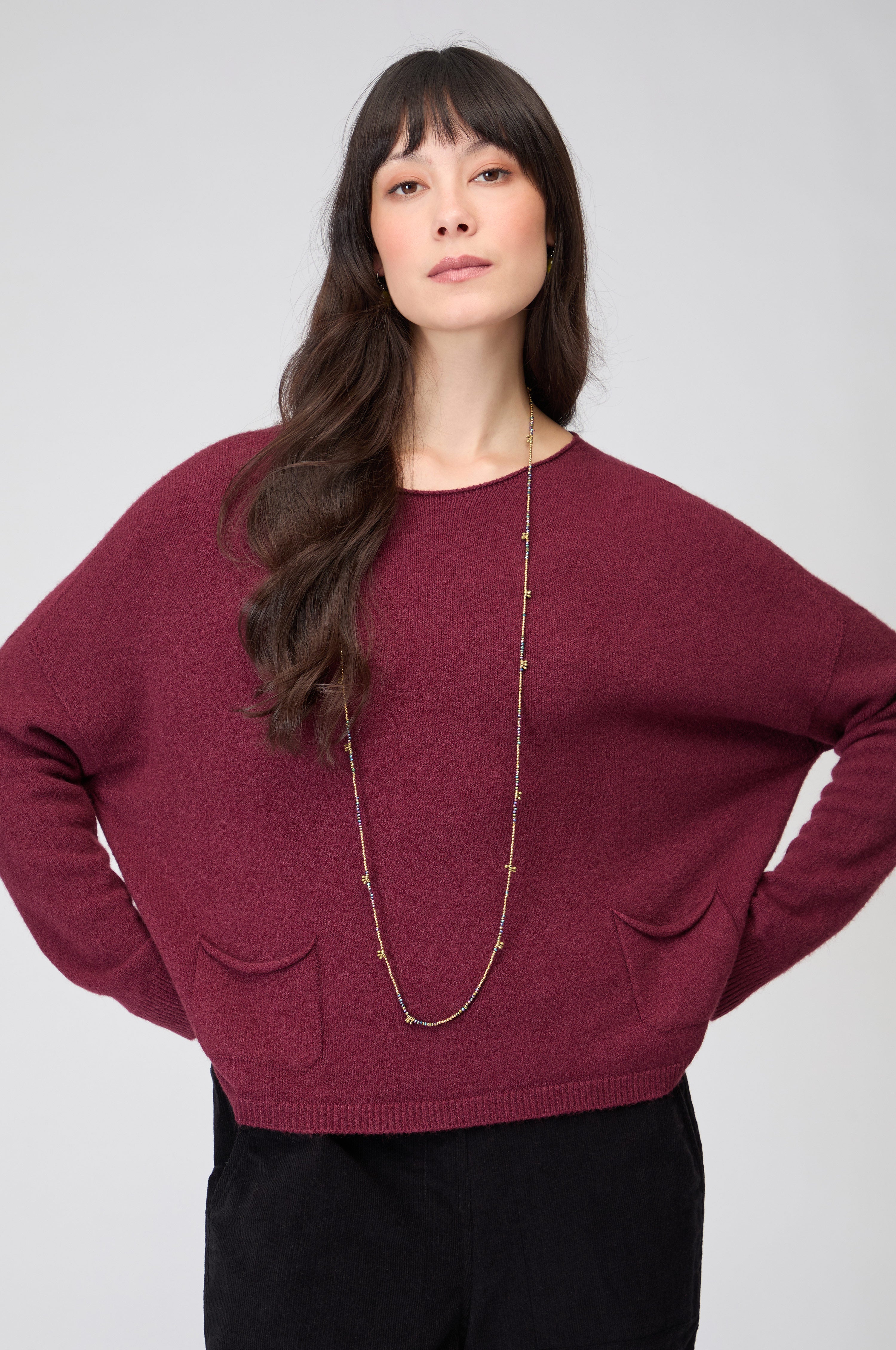 Spun from a viscose-rich yarn that feels silky against the skin, the design falls into a flattering, boxy cut that moves with the body. Two front pockets add subtle texture and utility, balancing simplicity with charm. Lightweight yet warm, this women’s soft knit jumper is an easy, elevated layer for every season.