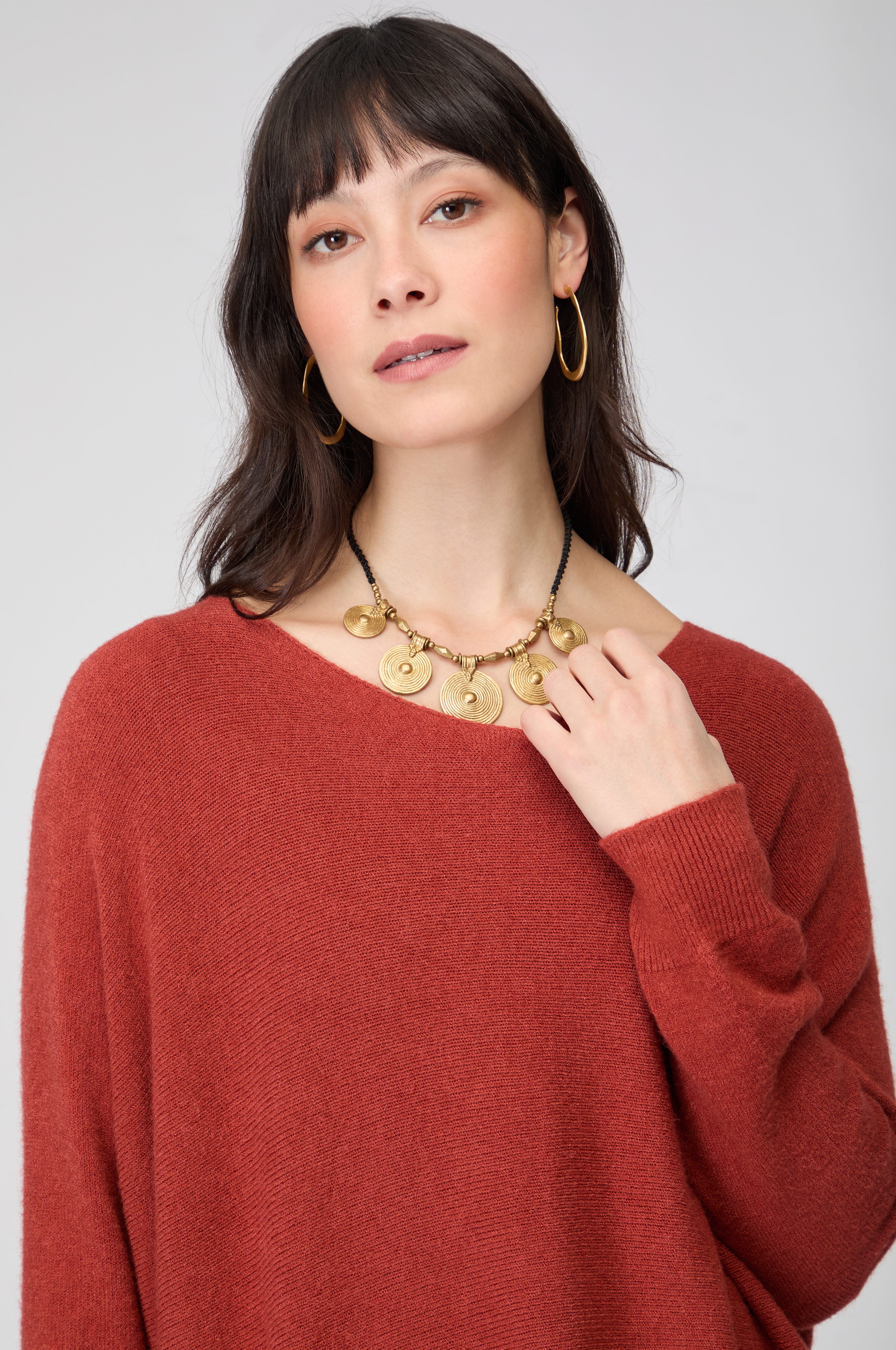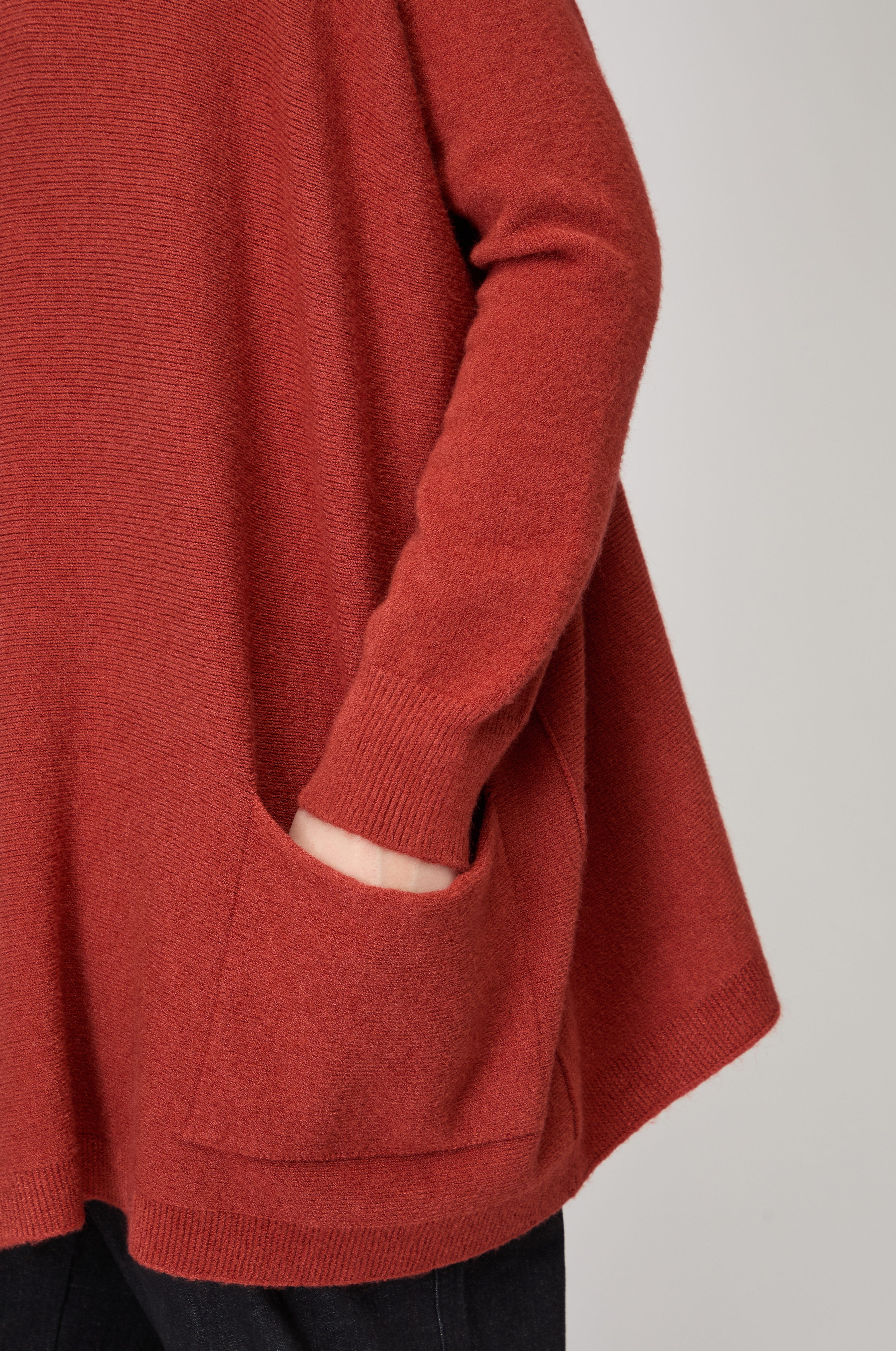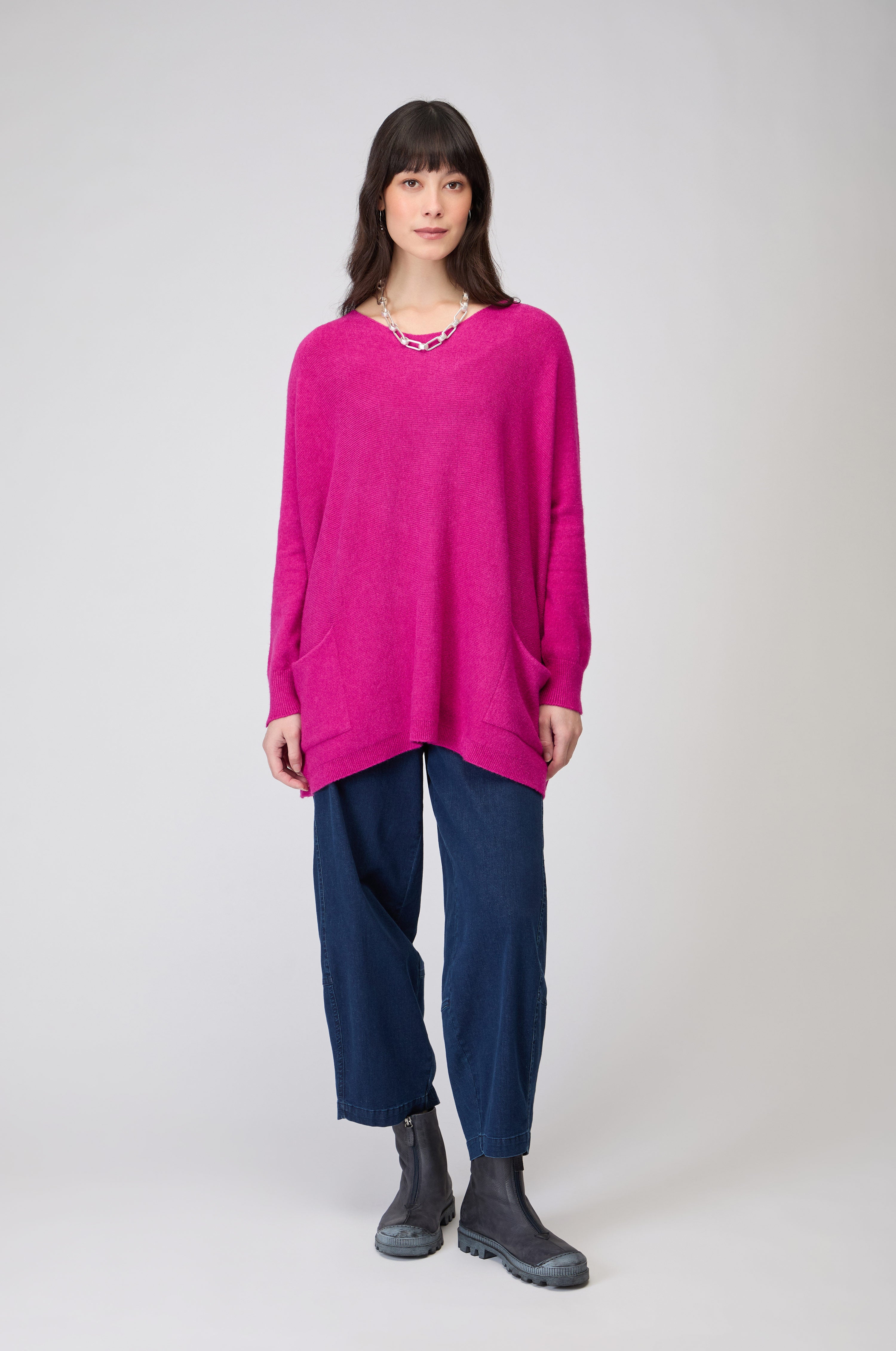 Knitted from a viscose-rich blend that feels weightless and silky against the skin, the fabric drapes with ease, moving fluidly with every gesture. Its generous shape slips gracefully over the frame, while two deep front pockets add both character and practicality. This women’s soft knit jumper captures the essence of laid-back luxury: timeless, tactile, and made to be cherished season after season.