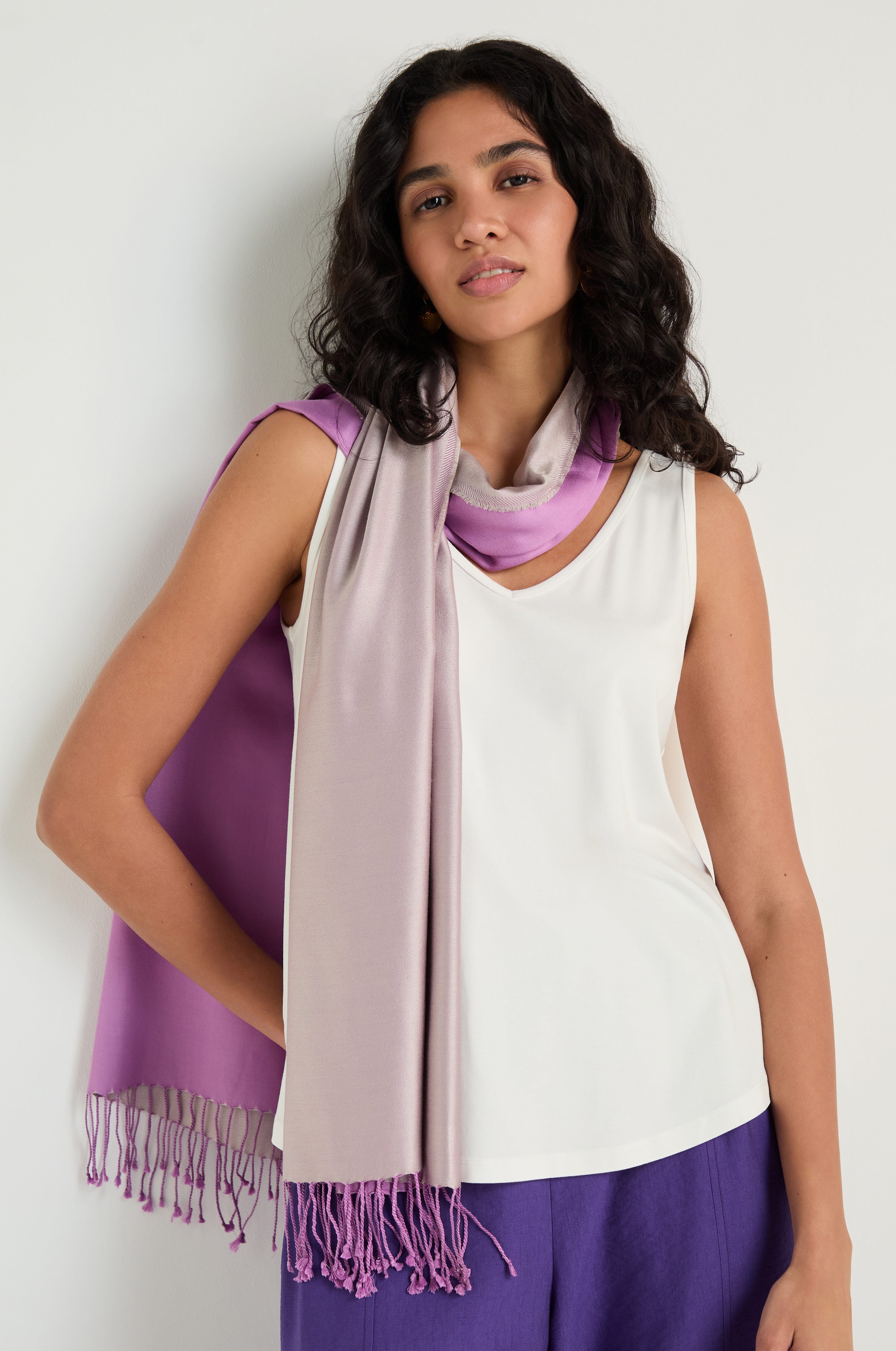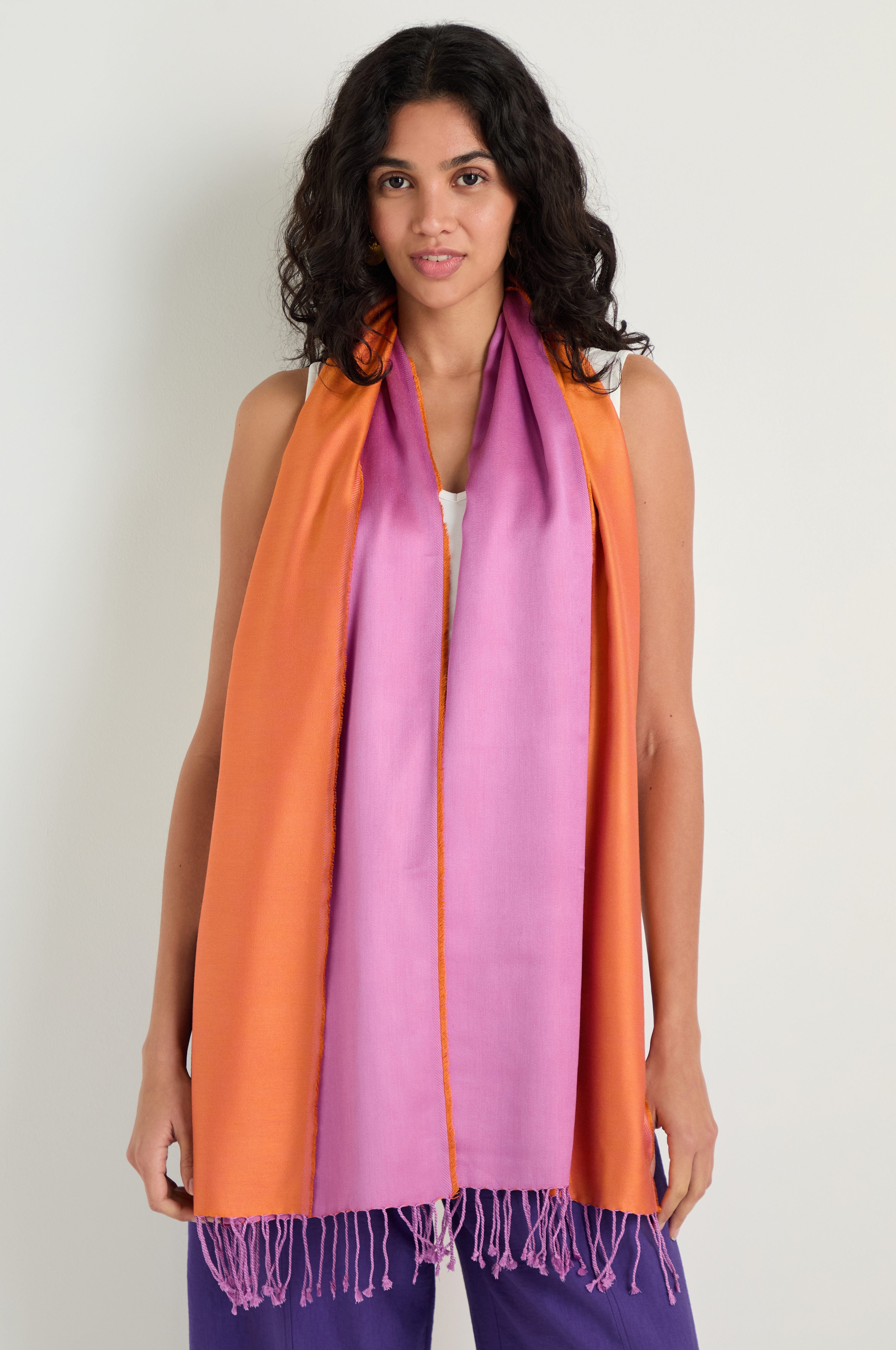 The Sahara Two Tone Silk Scarf focuses on colour contrast rather than print, allowing the natural sheen of pure silk to do the work. The soft yet saturated tones are placed side by side in broad panels, creating depth and movement as the fabric catches the light, with a refined finish that feels timeless rather than decorative.