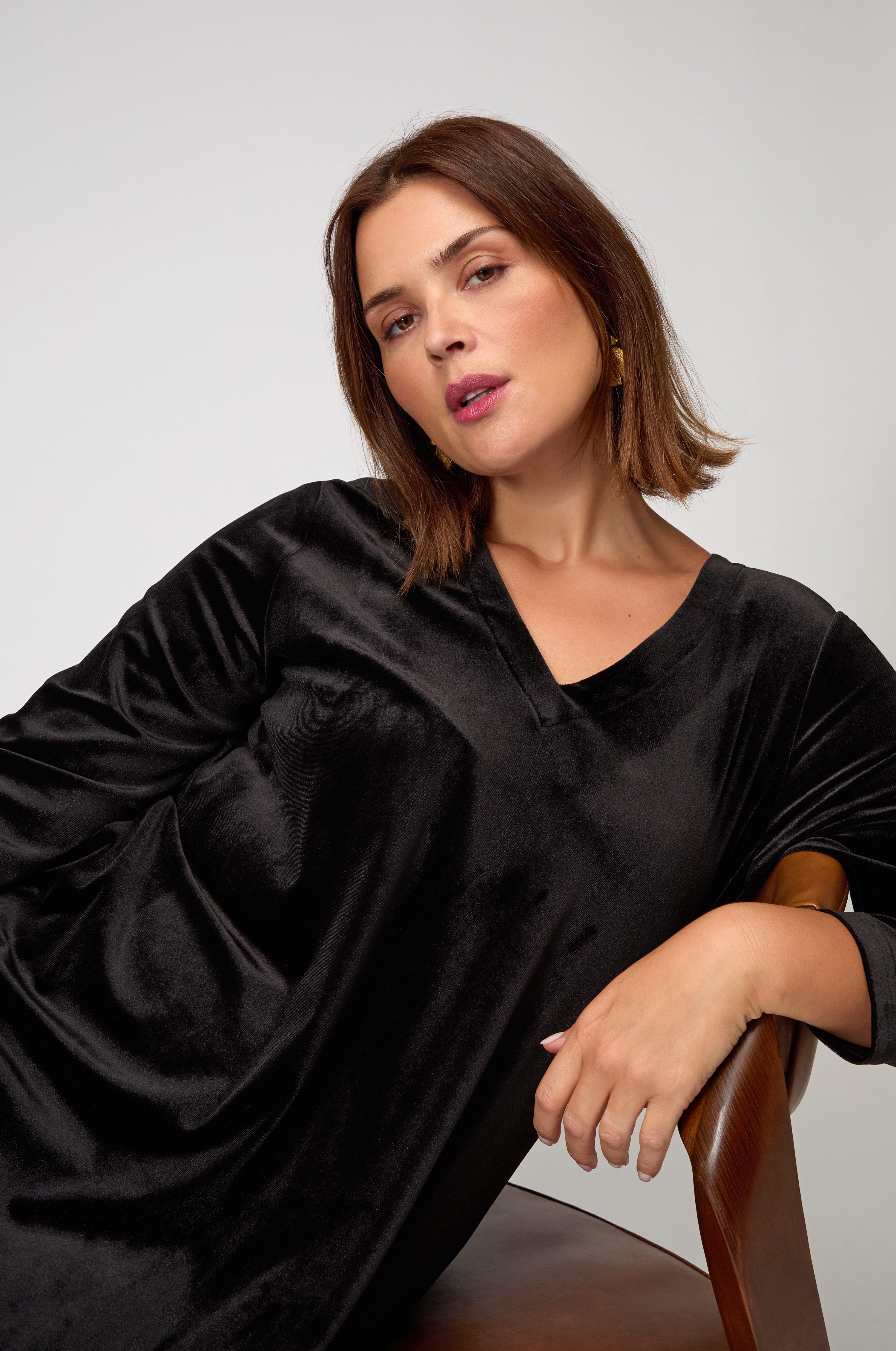 The Sahara Velvet Jersey Bubble Dress reimagines the brand’s signature bubble silhouette in velvet jersey. Darted hems create volume and movement, subtle pockets add convenience, while the V-neck and long sleeves keep the shape balanced. The velvet surface shimmers with light, adding richness to its sculptural cut.