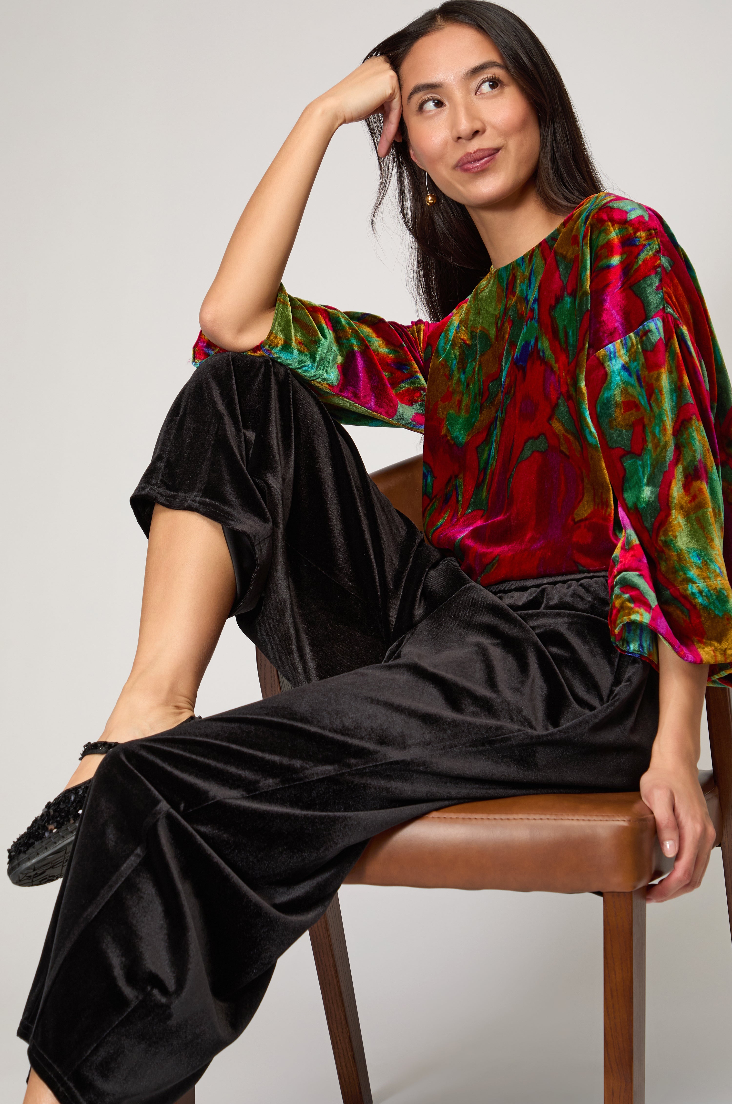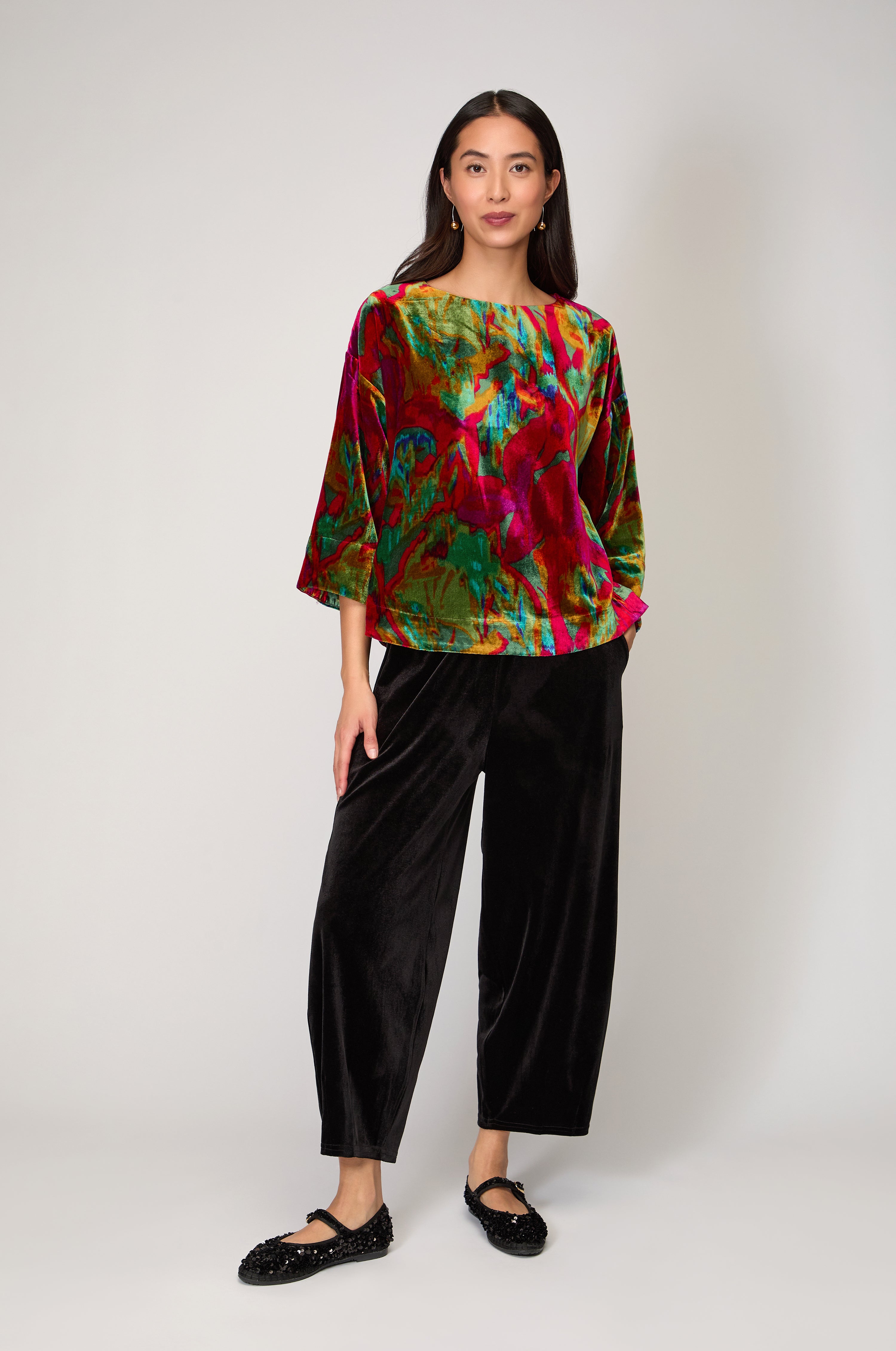 The Sahara Velvet Jersey Bubble Trouser brings a sculptural edge to everyday dressing. Crafted in velvet jersey with natural stretch, the fabric holds its shape while remaining comfortable. The curved leg narrows into tapered hems, with an elasticated waistband and discreet pockets adding practicality.