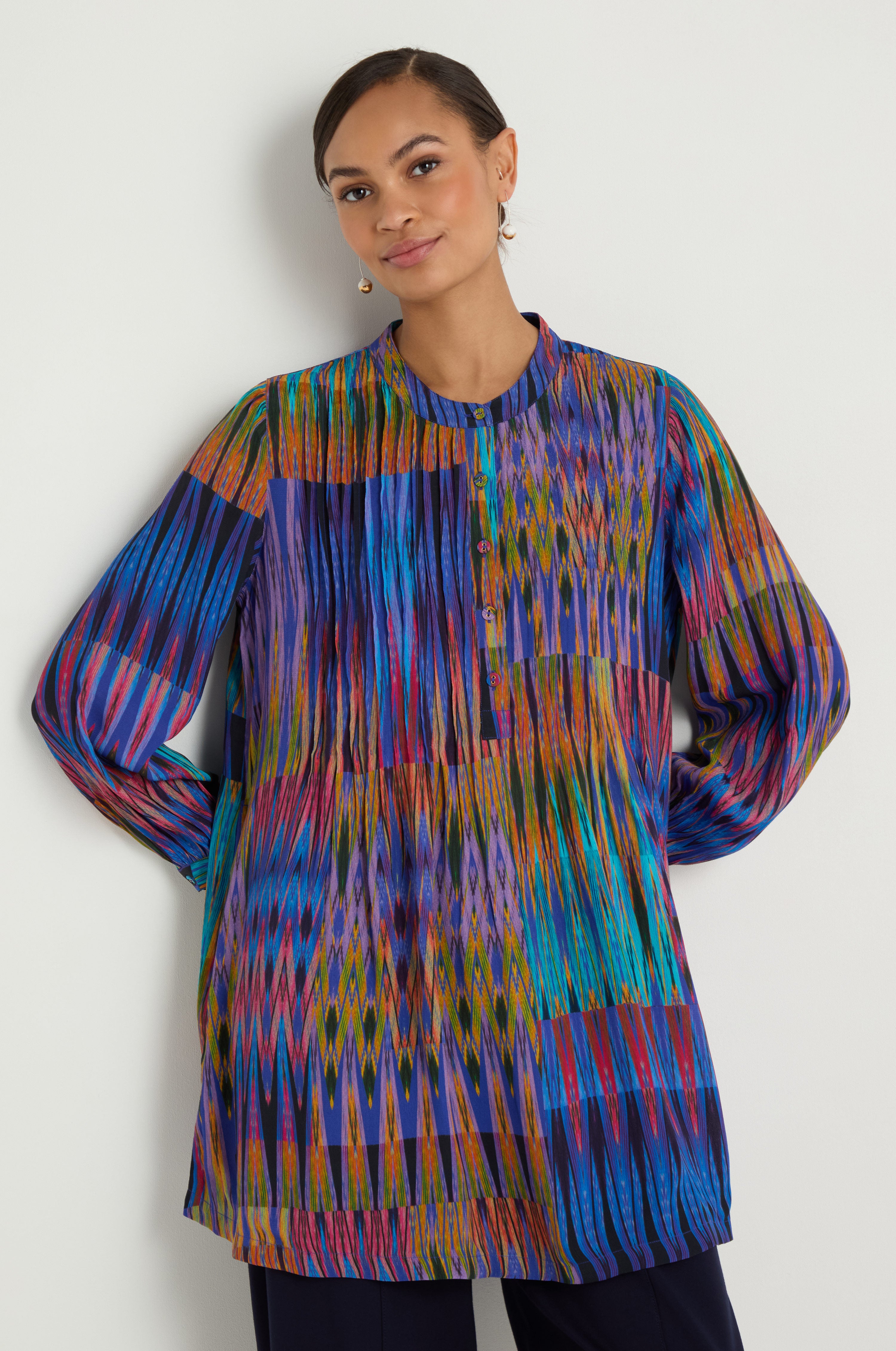 The Sahara Vivid Ikat Patchwork Top brings an expressive, colourful print into an easy, everyday shape. Cut from fluid viscose, it has a relaxed swing silhouette designed to skim the body, letting the colour and pattern take focus. An effortless piece that lifts simple trousers or denim.