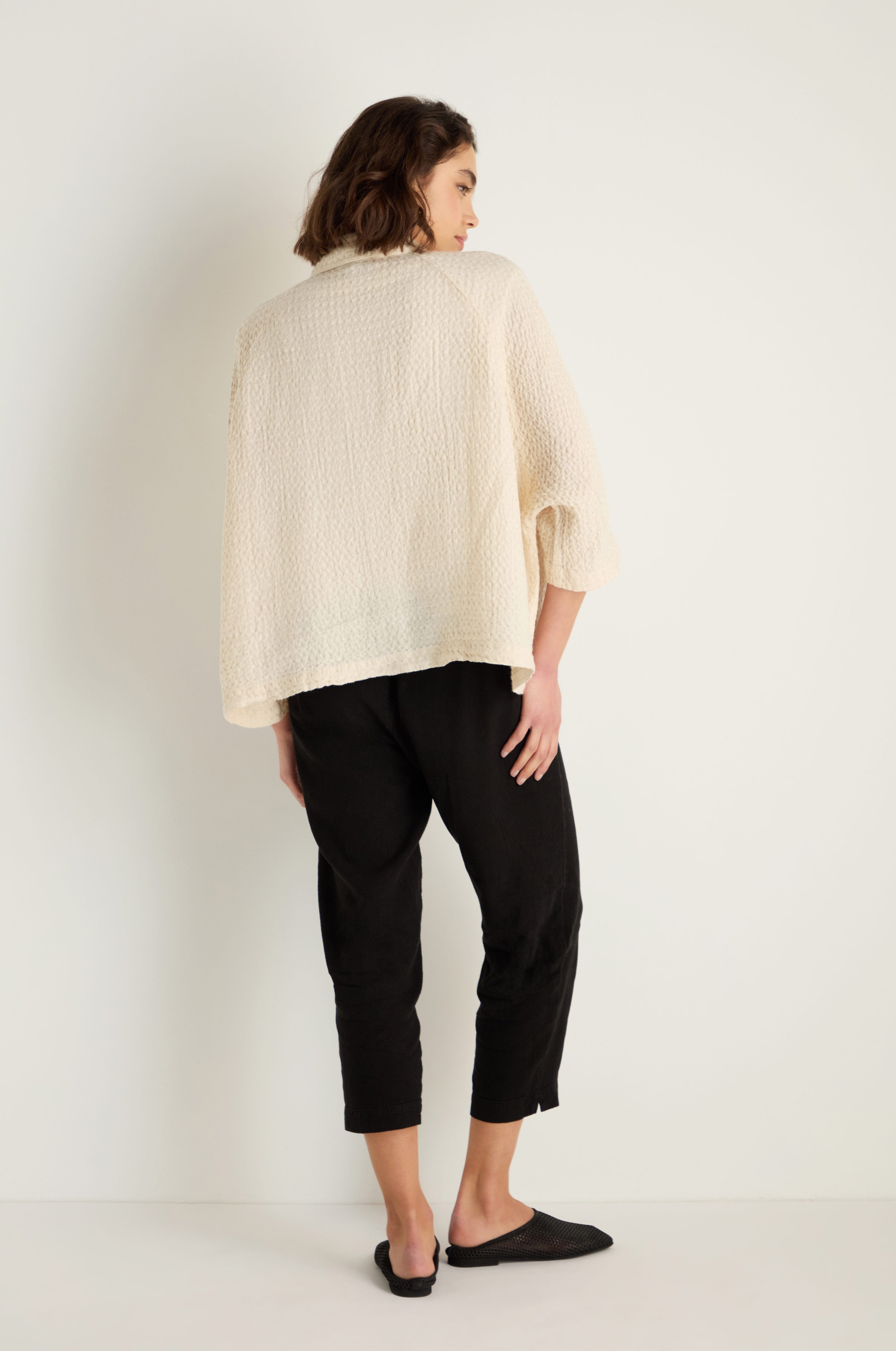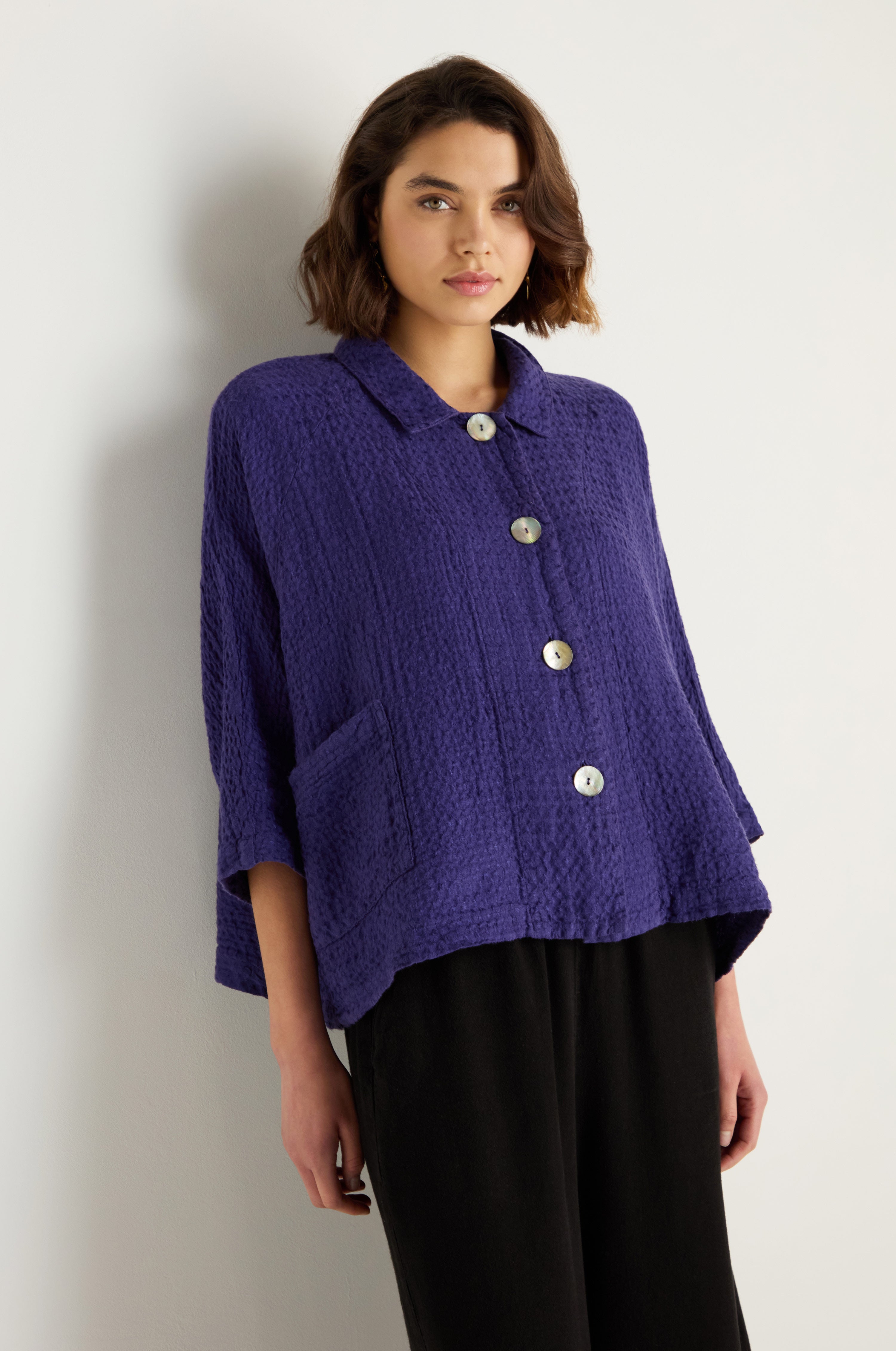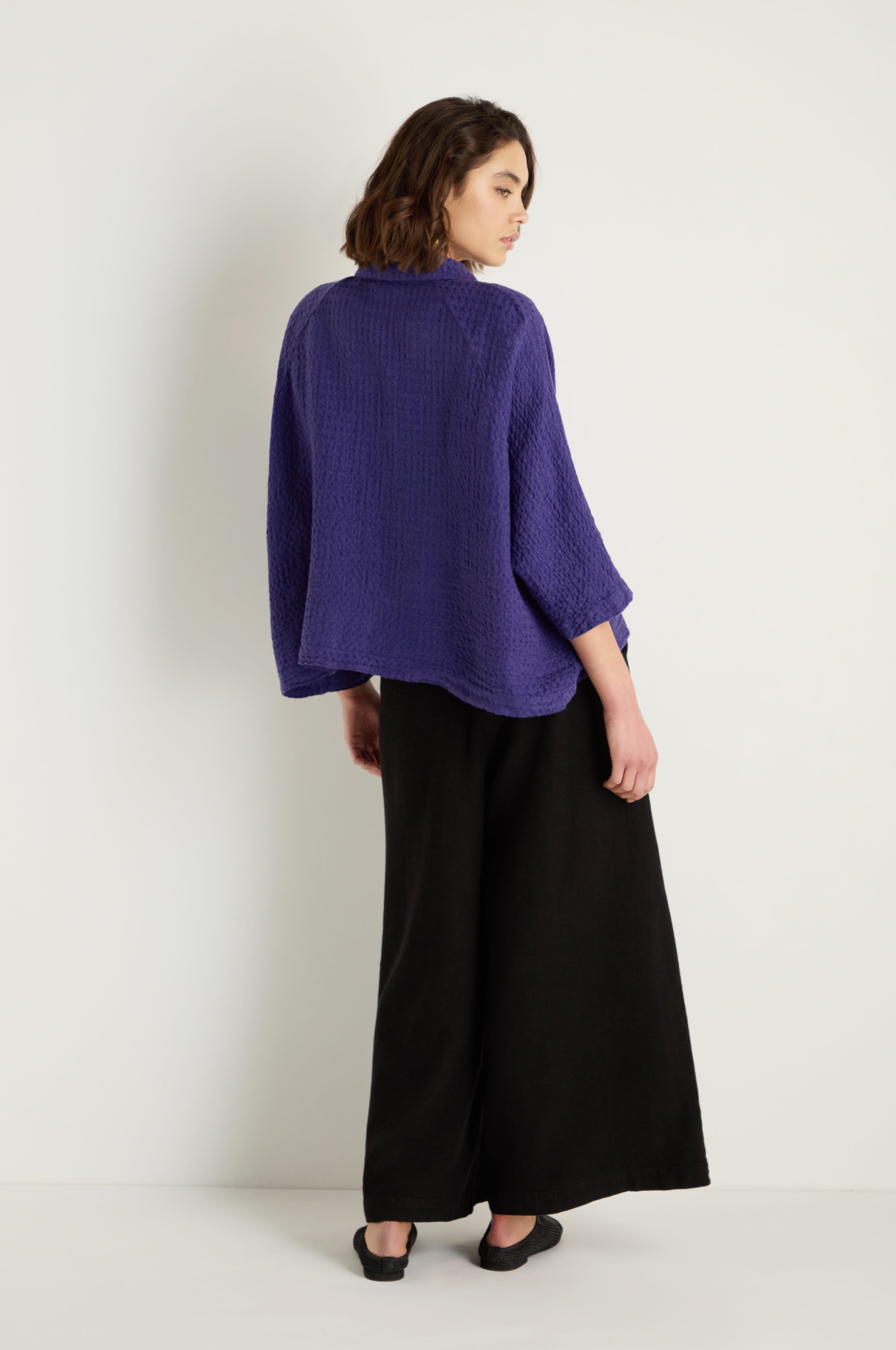 The Sahara Waffle Linen Boxy Jacket is cut from linen with a deeply textured waffle finish, giving it structure, softness, and a distinctive touchable surface. Designed with an oversized boxy shape, it layers easily while retaining a relaxed, draped feel.