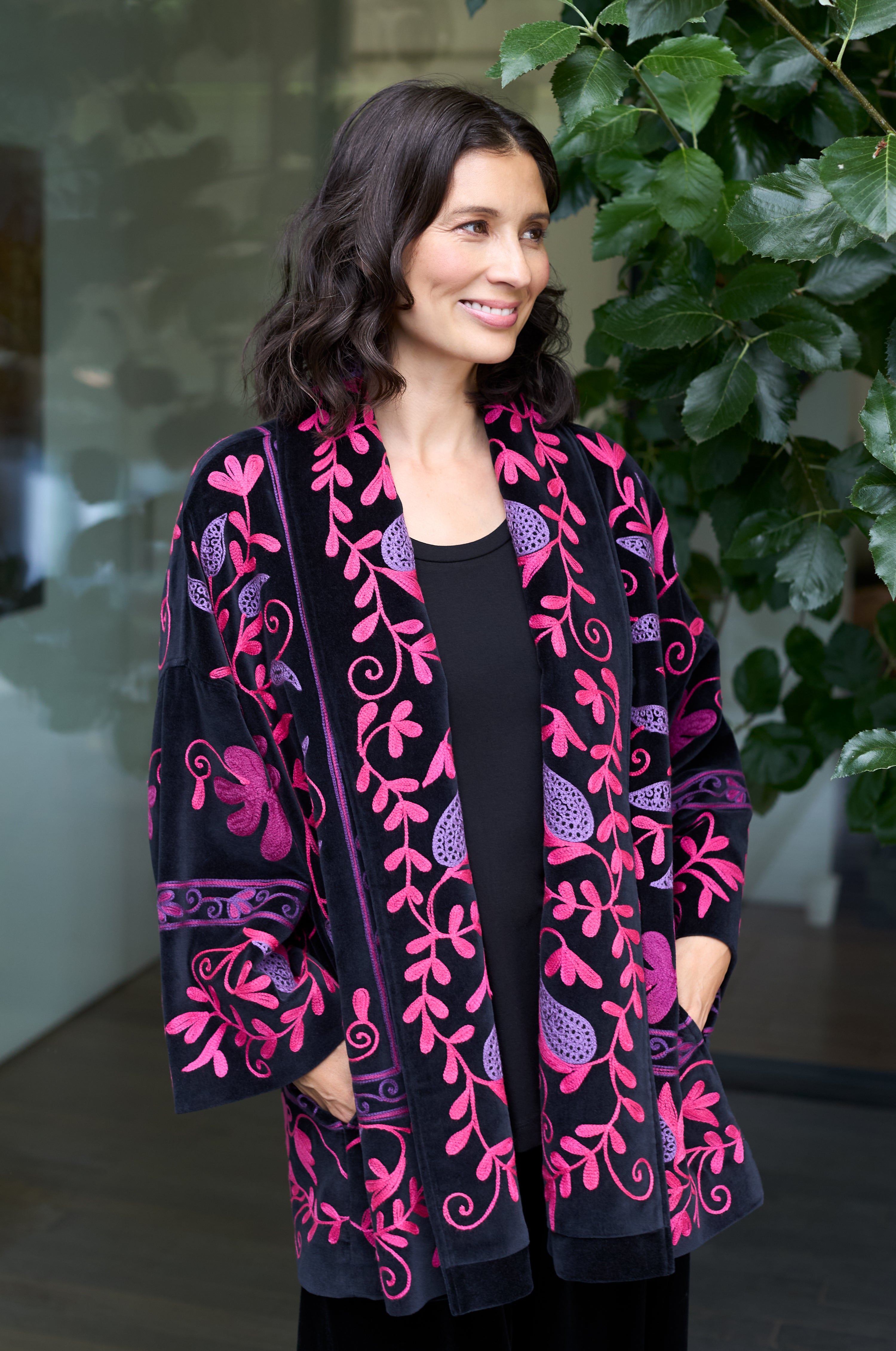 The Sahara Winter Embroidered Jacket showcases intricate embroidery across a soft base, each stitch adding dimension and artistry. The relaxed cut, with long sleeves and an open front, makes it easy to layer while ensuring the embroidery takes focus.