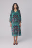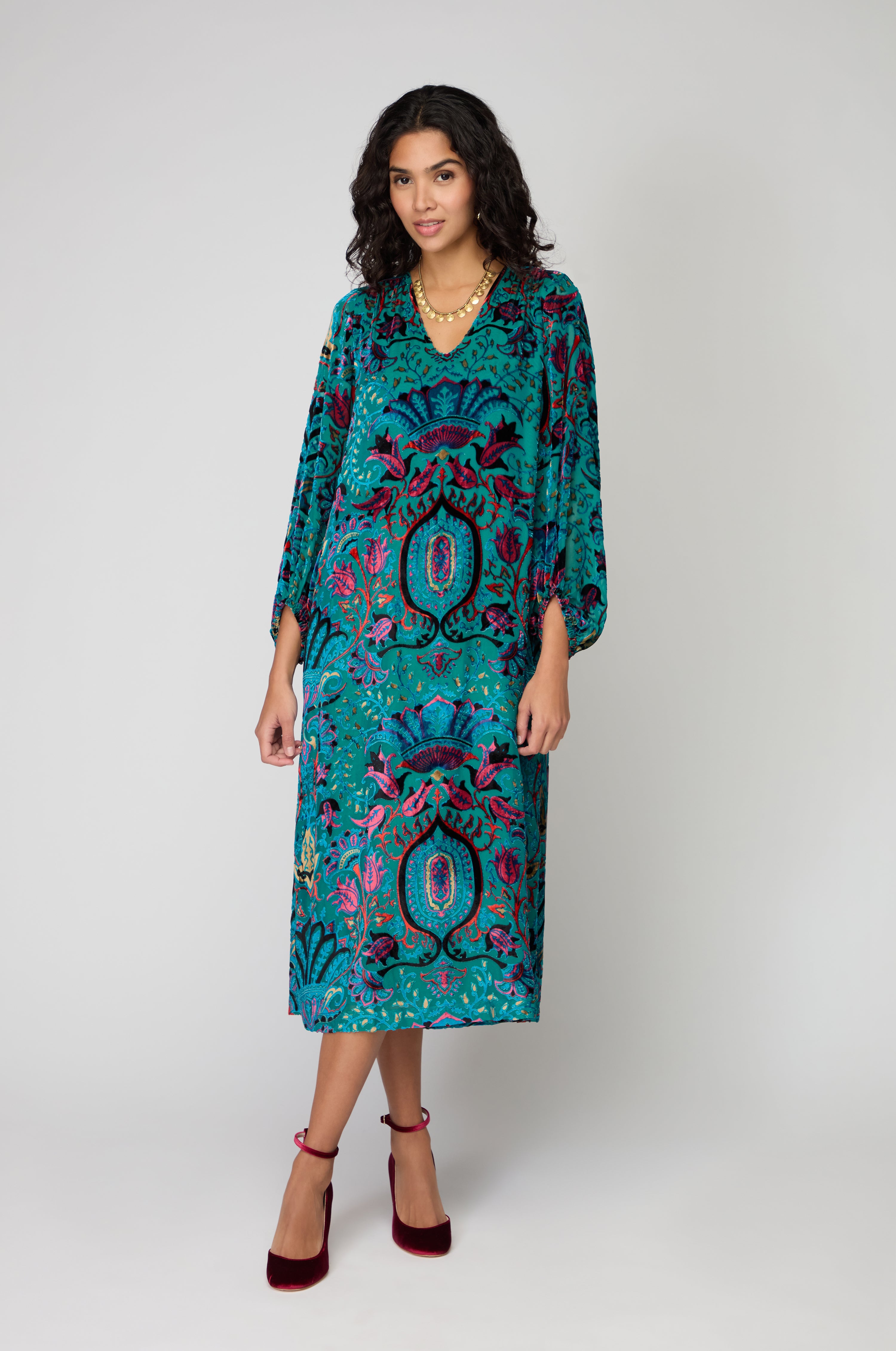 The Sahara Winter Paisley Devoré Dress showcases exquisite velvet devoré craftsmanship, blending sheer and opaque textures into an intricate paisley pattern. Its longline silhouette, round neckline, and elegantly draped, unlined full sleeves create a striking contrast that adds drama and movement.